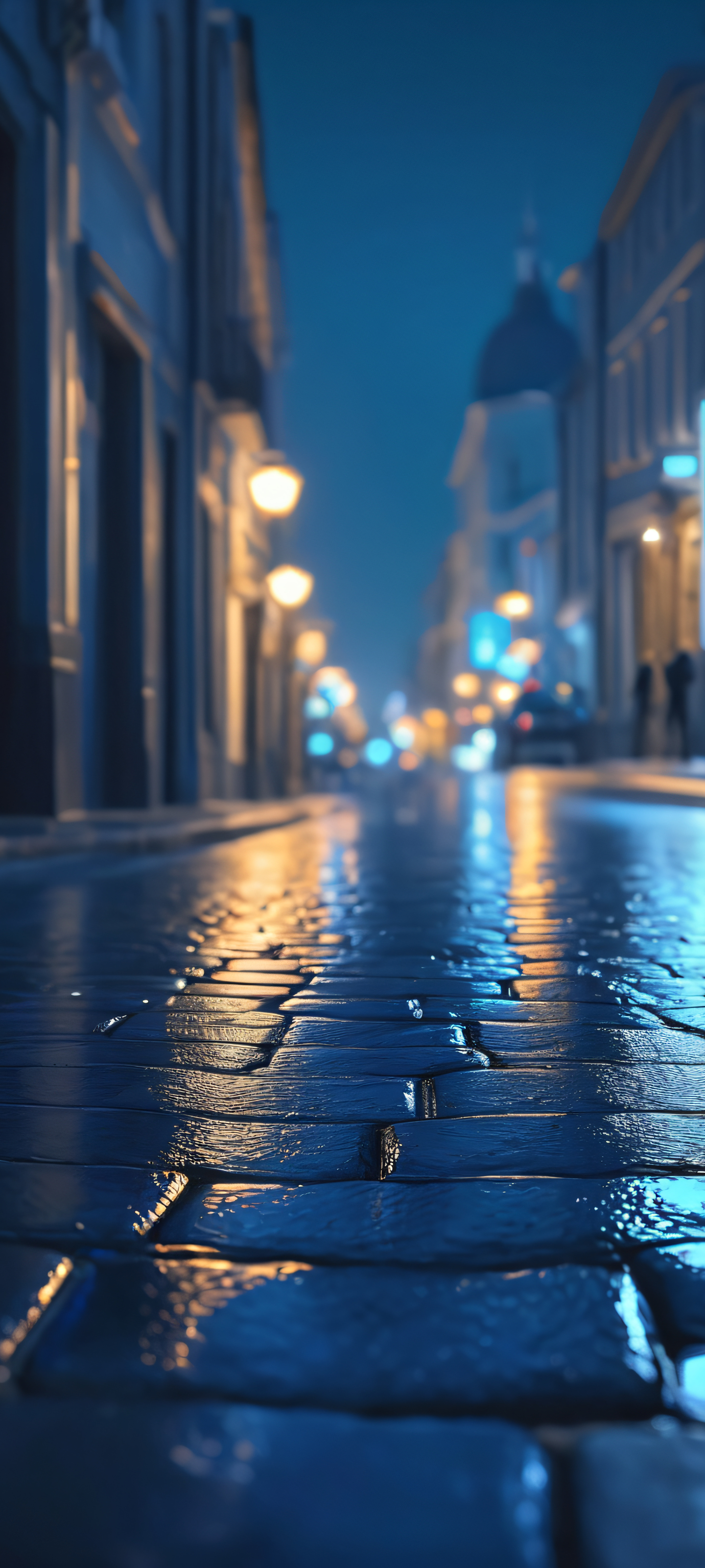 Indulge in the mystique of the city at night. This stunning vertical mobile wallpaper is perfectly optimized for iPhone, Samsung Galaxy, and Android home screens, featuring a highly detailed and highest quality 2K QHD image of a bustling street, with deep blues and grays that evoke the mystery of the night.
