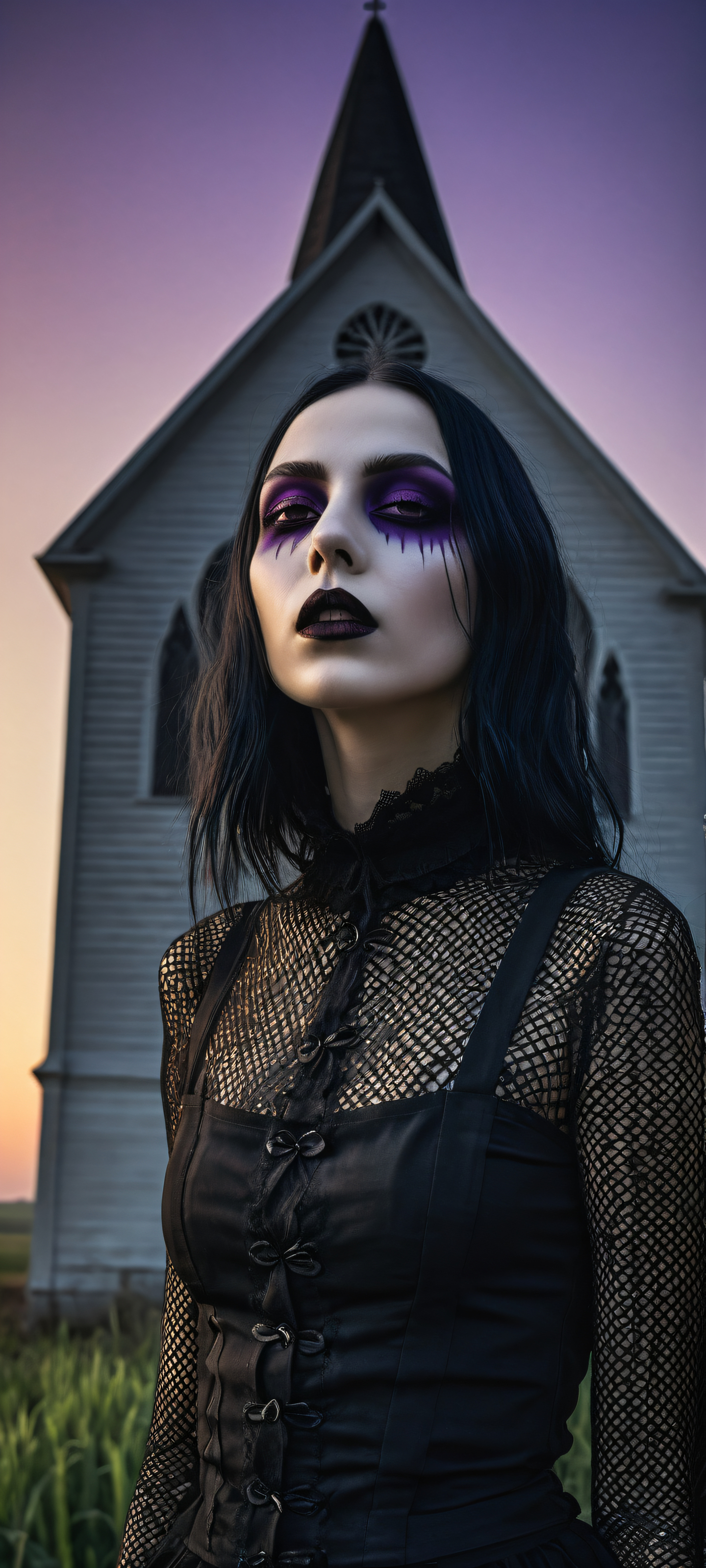 A breathtaking vertical portrait artwork of A young goth woman, placed in the lower-middle with intricate micro-details, posing with finger at mouth, black fishnet shirt, Perfectly clean and empty top half with vast pure void, featuring a terrifying, glitched scarecrow against a backdrop of fields and old black church in LA, Award-winning digital art, pristine clarity, with masterfully blended brushstrokes and sophisticated texture, Ethereal lighting with radiant, brilliant colors, ray-traced reflections, and pristine clarity, evoking an otherworldly atmosphere, Dominant palette of dark blues and purples, with touches of eerie green, inspired by the style of horror cinema, ethereal lighting, radiant, brilliant colors, ray traced reflections, pristine clarity, portrait composition, centered subject in the lower middle, perfectly clean and smooth top half for UI, extreme depth of field blurred background, highly textured surfaces, intricate micro-details, physically based rendering, award-winning digital art, epic breathtaking scale, stunning visual impact, perfect composition, macOS wallpaper aesthetic, masterpiece, 2K QHD resolution, 9:20 aspect ratio.