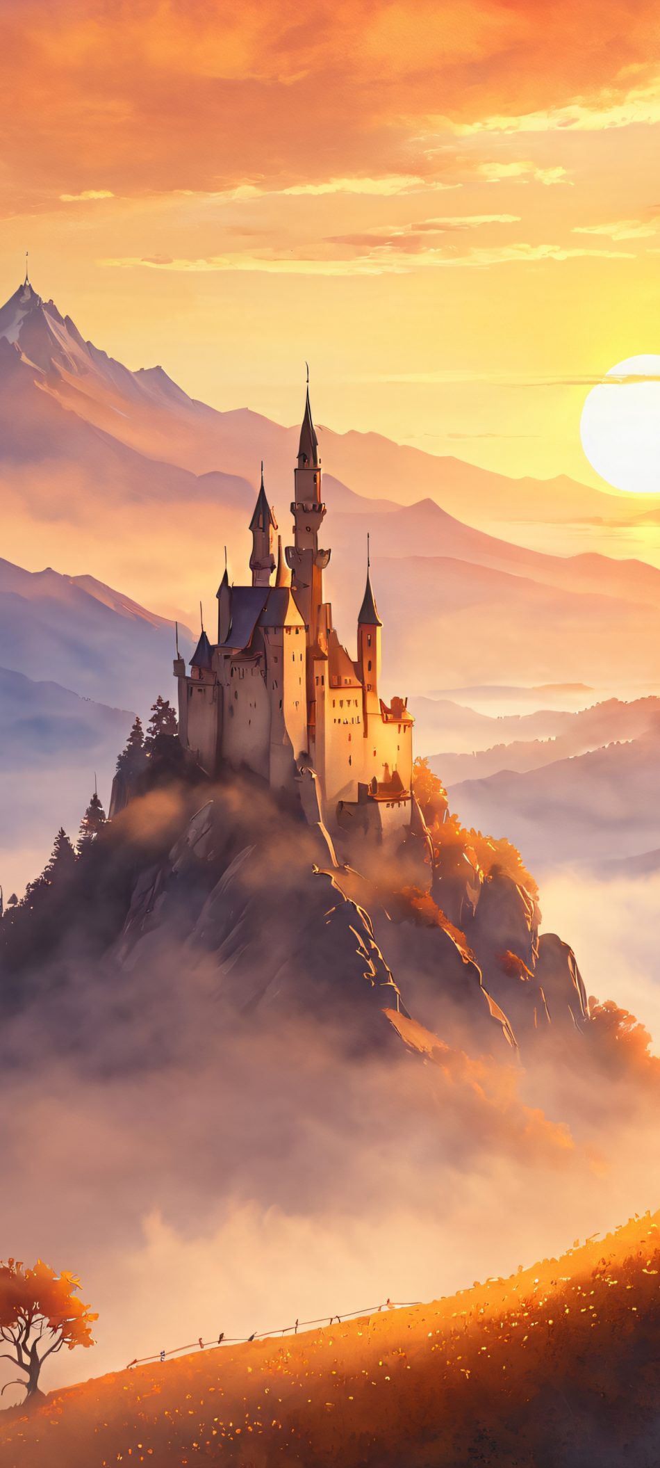 Elevate your mobile home screen with this breathtaking 2K QHD masterpiece, expertly crafted for seamless display on iPhone, Samsung Galaxy, and Android devices. Soft misty mountains meet a warm sunset, as a majestic castle stands tall, waiting to be cherished on your phone’s screen.