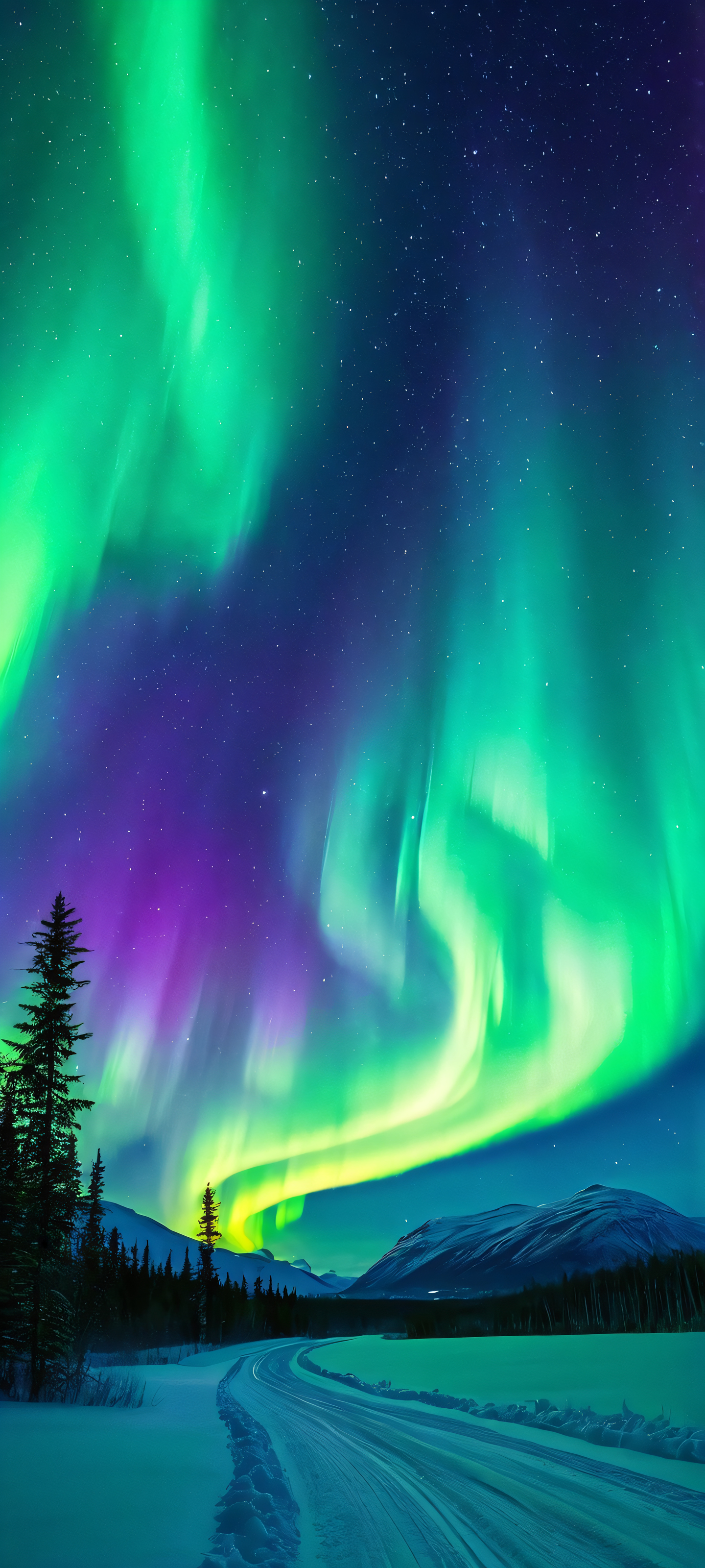 Immerse yourself in the breathtaking beauty of this stunning 2K QHD mobile phone wallpaper, perfectly optimized for your iPhone, Samsung Galaxy, or Android home screen. This dreamy masterpiece captures the majesty of the Northern Lights on a moonlit night sky, with swirling curtains of green, yellow, and purple hues that will leave you mesmerized.