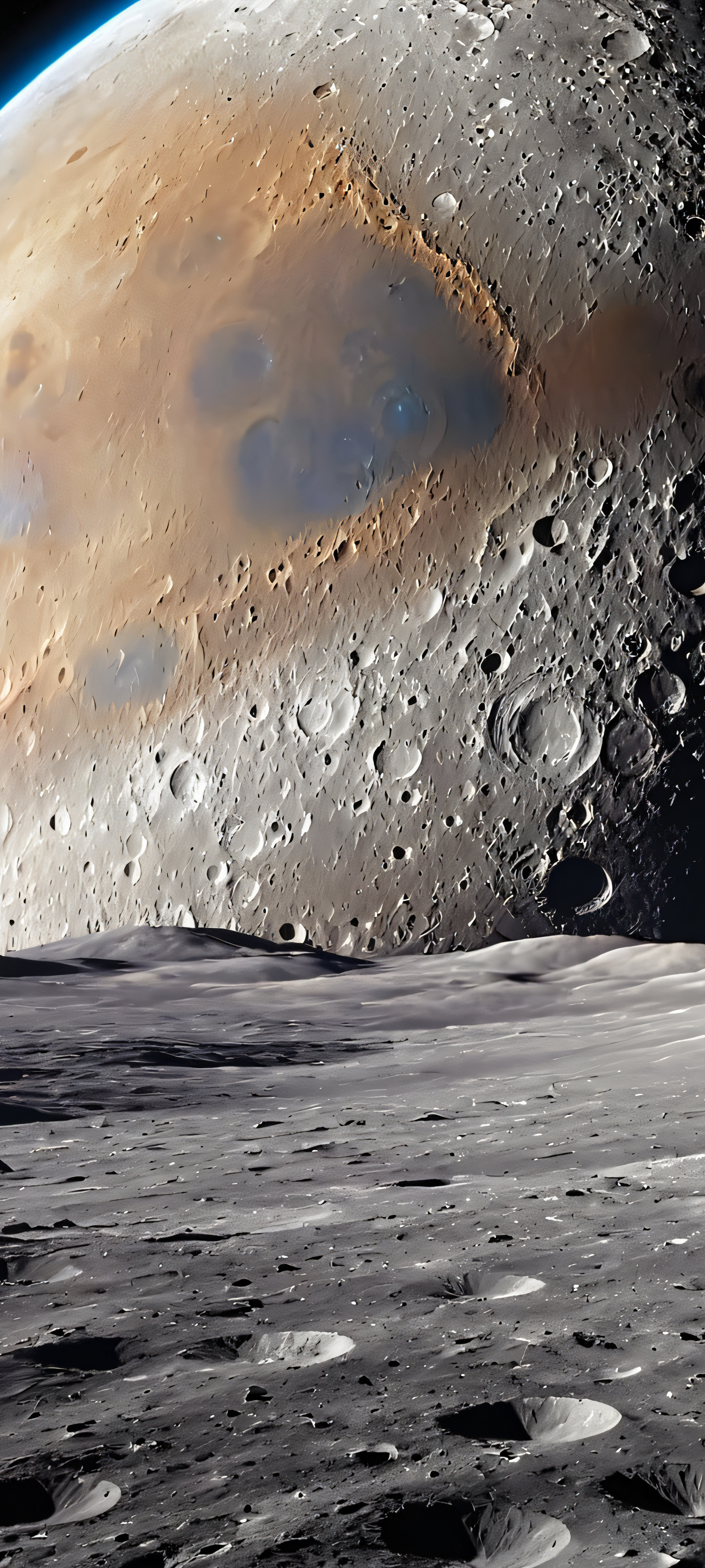 Vertical mobile wallpaper of Earth from the Moon, showcasing a breathtaking lunar landscape with softly lit details, perfectly optimized for iPhone and Android devices.