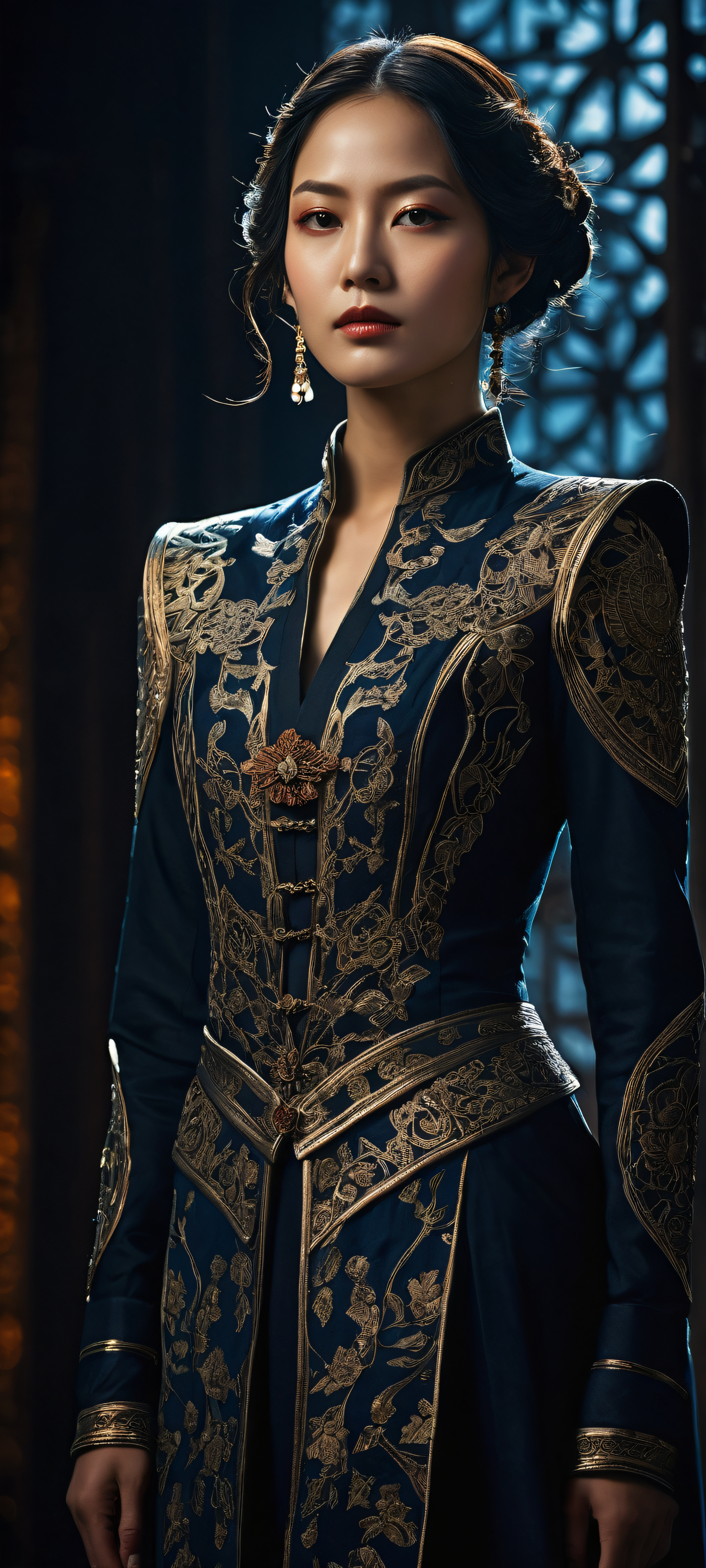 A breathtaking vertical portrait artwork of A lone figure of a young woman placed in the lower-middle with insane micro-details, showcasing intricate designs on her clothing and accessories, Perfectly clean and empty top half with vast pure void, contrasted against a moody dark background with slight gradient of dark amber hues in the shadows, Award-winning digital art, pristine clarity with stunning visual impact inspired by the dark fantasy world of Genshin Impact, Sidelighting with deep shadows, creating an eerie atmosphere with subtle highlight on the subject’s face and clothing details, Dominant palette of dark greys, blues, and ambers, with a focus on deep, rich tones to evoke a sense of mystery and intrigue, elegant low-key lighting, deep perfect blacks, striking contrast, sleek dark mode aesthetic, luminescent accents, deep rich colors, portrait composition, centered subject in the lower middle, perfectly clean and smooth top half for UI, extreme depth of field blurred background, highly textured surfaces, intricate micro-details, physically based rendering, award-winning digital art, epic breathtaking scale, stunning visual impact, perfect composition, macOS wallpaper aesthetic, masterpiece, 2K QHD resolution, 9:20 aspect ratio.
