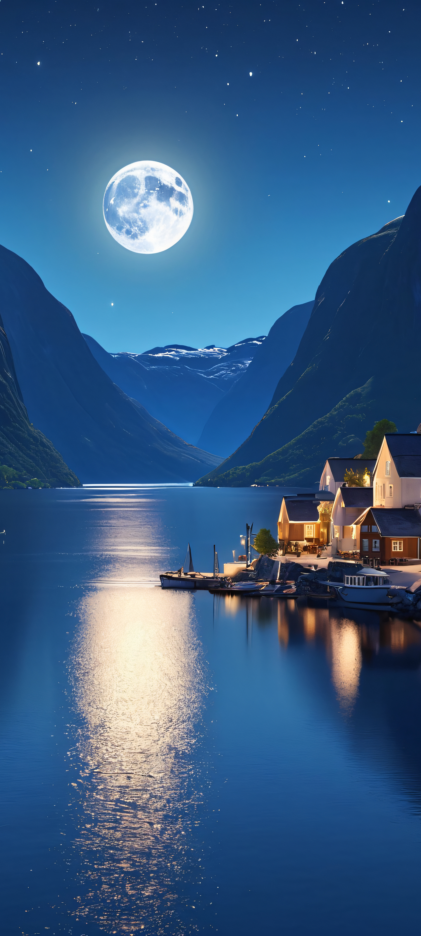 A serene and peaceful moonlit landscape of Fjord Town, perfect for iPhone, Android, or Samsung Galaxy home screens.