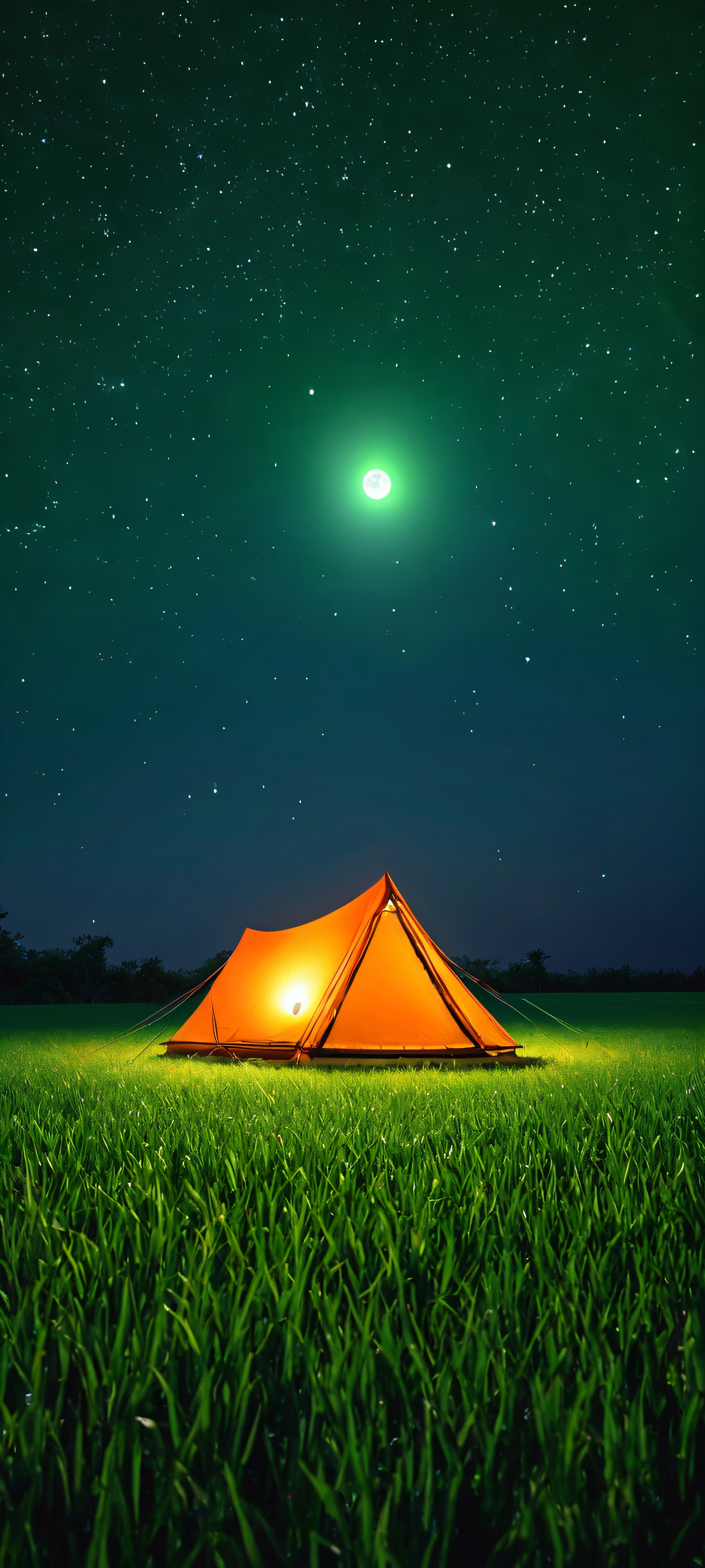 A stunning tent under a starry night sky with lush green grass and vibrant orange hues. Perfect for iPhone/Android home screens.
