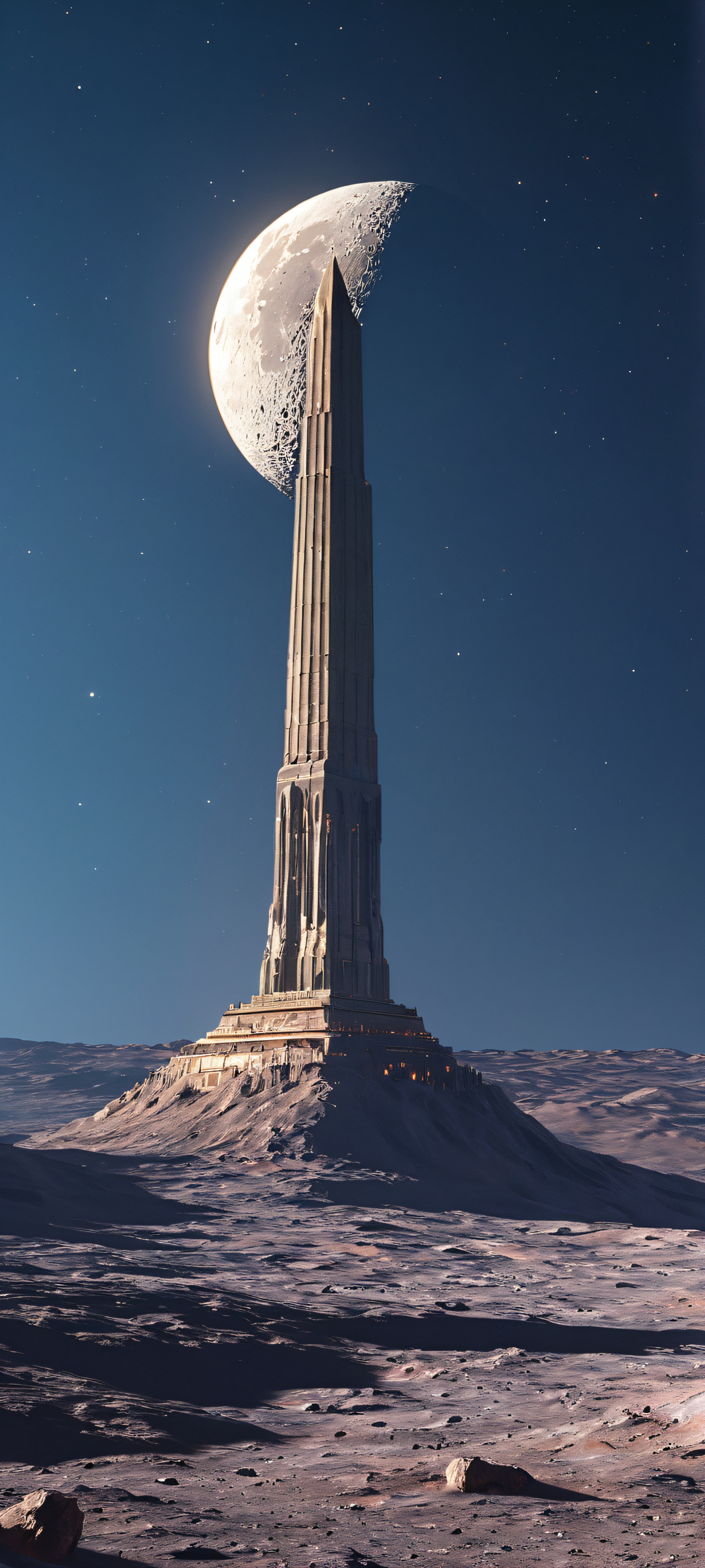 iPhone and Android compatible vertical mobile wallpaper of a breathtaking monument on the cratered moon surface with a futuristic glow.