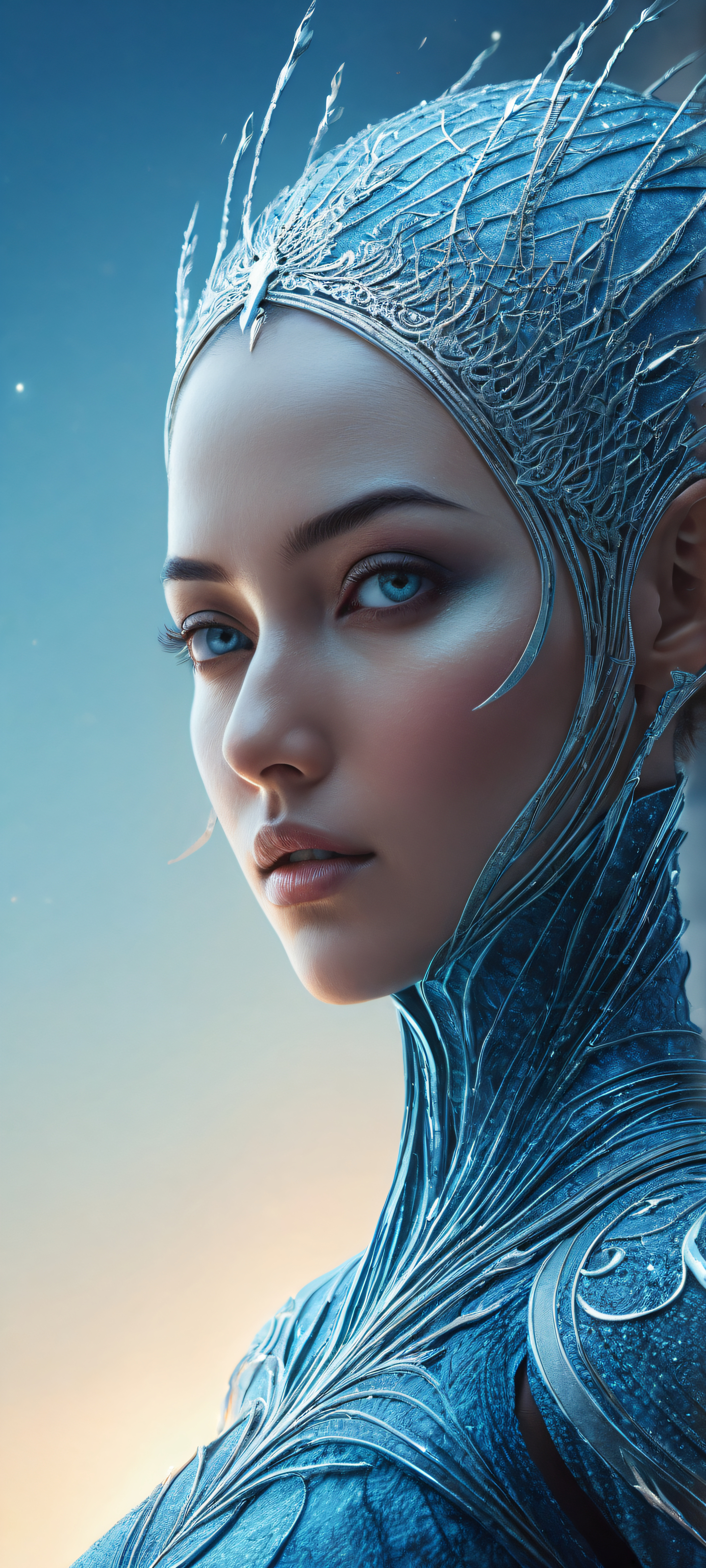 A breathtaking vertical portrait artwork of A Mostima-themed character with intricate details, placed in the lower-middle with insane micro-details and extreme depth of field., A vast, perfectly clean and empty top half with a pure void, providing ample breathing space for UI widgets., Award-winning digital art with stunning visual impact, perfectly capturing the essence of a high-end Apple iOS UI wallpaper, featuring flawless, crisp visuals., Ethereal lighting with radiant, brilliant colors, ray-traced reflections, and pristine clarity, giving the overall impression of being bathed in an otherworldly glow., A palette dominated by soothing blues, accented with dark, mysterious tones to evoke a sense of mystery and allure., ethereal lighting, radiant, brilliant colors, ray traced reflections, pristine clarity, portrait composition, centered subject in the lower middle, perfectly clean and smooth top half for UI, extreme depth of field blurred background, highly textured surfaces, intricate micro-details, physically based rendering, award-winning digital art, epic breathtaking scale, stunning visual impact, perfect composition, macOS wallpaper aesthetic, masterpiece, 2K QHD resolution, 9:20 aspect ratio.