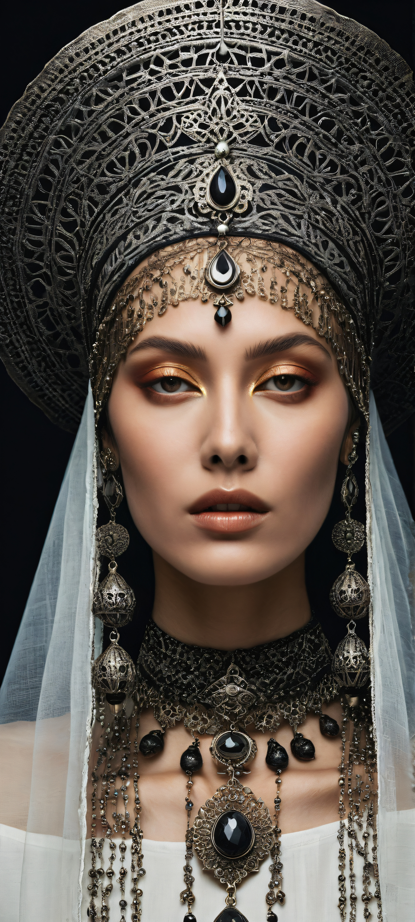 A breathtaking vertical portrait artwork of A mystic woman placed in the lower-middle, intricate micro-details of wind-worn skin texture, oxidized filigree medallions, and tiny bell charms are revealed as she commands the frame with an intense gaze., A perfectly clean and empty top half with a vast pure void, juxtaposed against a frayed linen veil that delicately masks the lower face, allowing the subject to dominate the frame., Award-winning digital art, pristine clarity, and stunning visual impact, reminiscent of Apple UI level quality, Sleek dark mode aesthetic with deep perfect blacks, striking crisp contrast, and elegant luminescent accents from sun glints across her skin, #333333, #454545, #666666, elegant low-key lighting, deep perfect blacks, striking contrast, sleek dark mode aesthetic, luminescent accents, deep rich colors, portrait composition, centered subject in the lower middle, perfectly clean and smooth top half for UI, extreme depth of field blurred background, highly textured surfaces, intricate micro-details, physically based rendering, award-winning digital art, epic breathtaking scale, stunning visual impact, perfect composition, macOS wallpaper aesthetic, masterpiece, 2K QHD resolution, 9:20 aspect ratio.