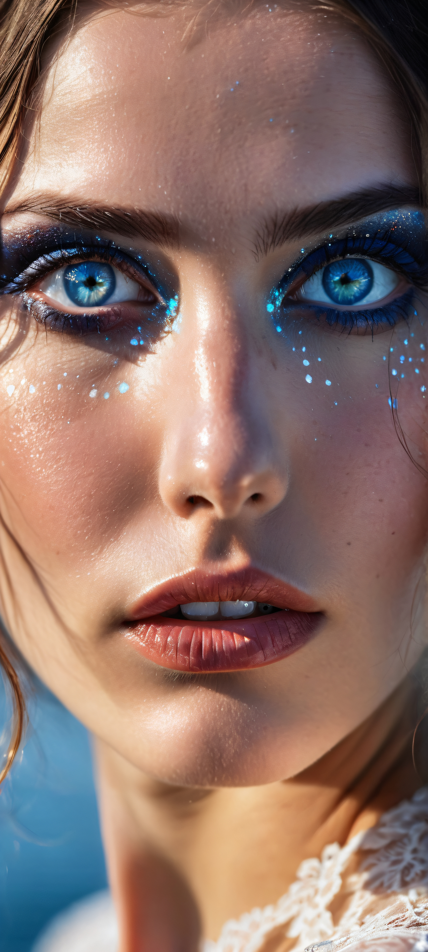 This breathtaking digital artwork is perfectly optimized for your iPhone, Samsung Galaxy, or Android home screen. The mystic maiden takes center stage amidst a vast, dark expanse, with an endless void above and a blurred background that subtly suggests depth. Her delicate blue eyes sparkle with an otherworldly intensity, while her skin glows with a luminescent quality, inviting you to step into her mystical realm.