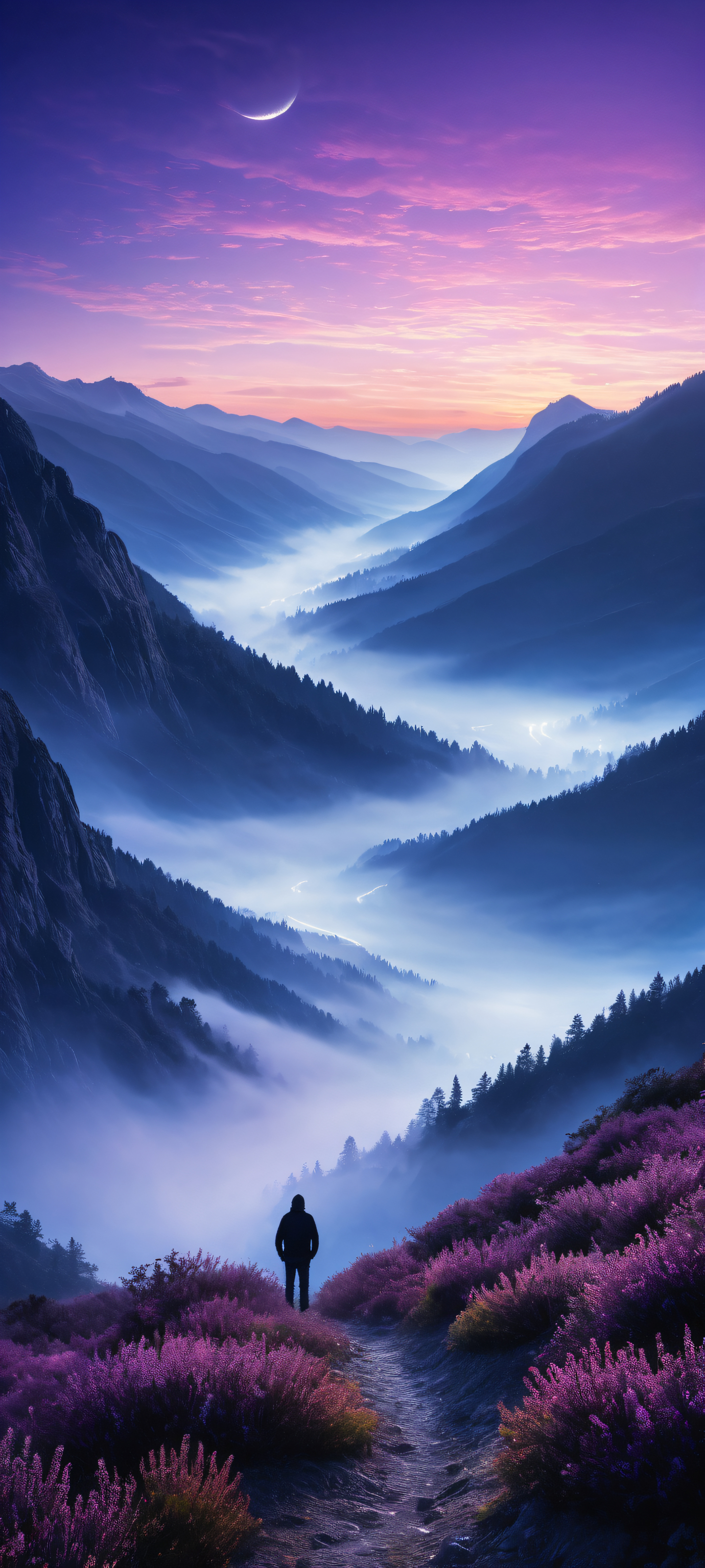 A breathtaking vertical portrait artwork of A mystical, glowing valley placed in the lower-middle, intricate micro-details of misty fog and dark mountain silhouettes, Perfectly clean and empty top half with vast pure void, a simple night sky above, and a deep valley filled with thick fog below, Award-winning digital art with stunning visual impact and pristine clarity, Ethereal lighting with a soft purple and blue glow emanating from the fog, casting a radiant light on the surrounding landscape, Dominant shades of misty purple and blue, complemented by dark silhouettes and a star-filled night sky above, ethereal lighting, radiant, brilliant colors, ray traced reflections, pristine clarity, portrait composition, centered subject in the lower middle, perfectly clean and smooth top half for UI, extreme depth of field blurred background, highly textured surfaces, intricate micro-details, physically based rendering, award-winning digital art, epic breathtaking scale, stunning visual impact, perfect composition, macOS wallpaper aesthetic, masterpiece, 2K QHD resolution, 9:20 aspect ratio.