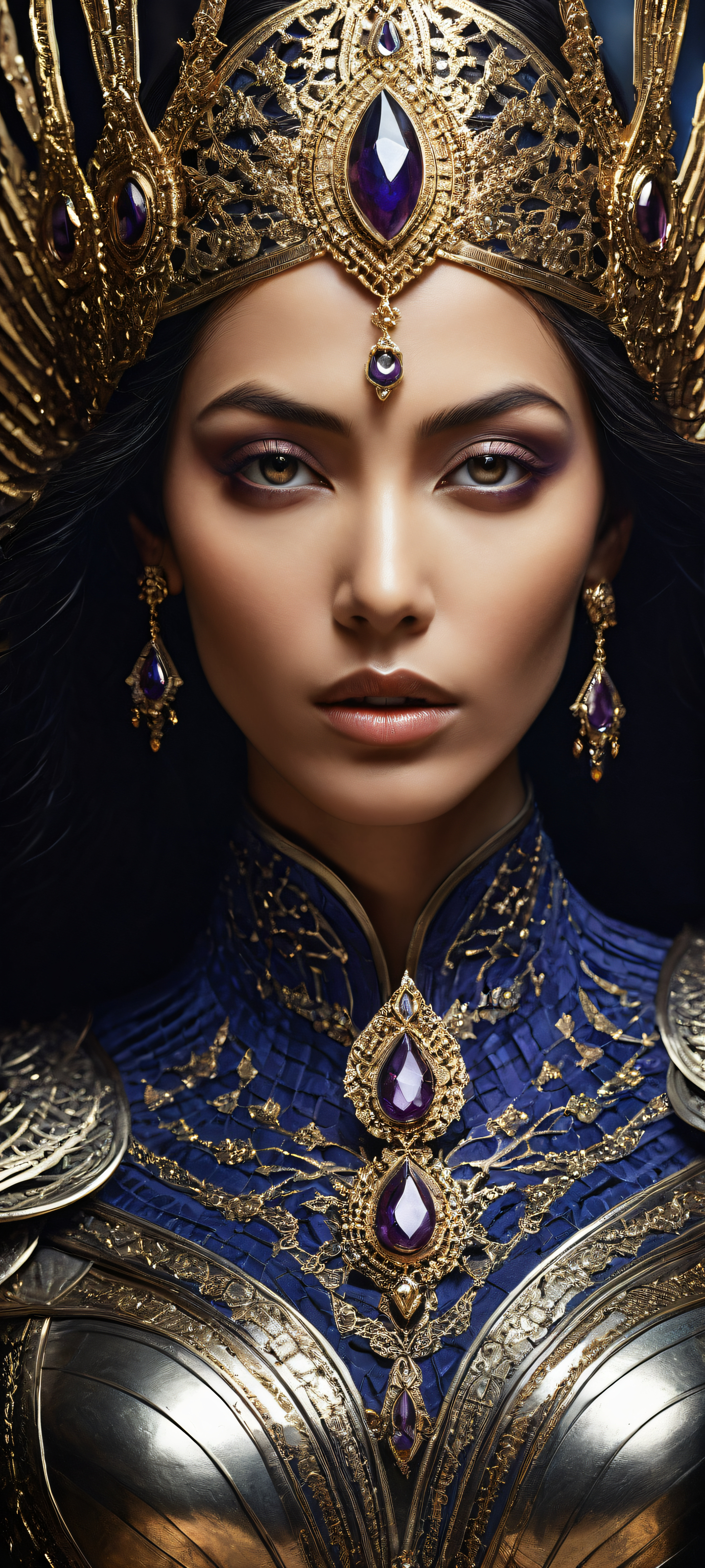 A breathtaking vertical portrait artwork of A mystical woman, placed in the lower-middle with intricate micro-details on her dark, ornate armor and flowing dark hair., The perfectly clean and empty top half serves as a vast pure void, allowing the viewer’s gaze to naturally drift down to the subject, creating an unobstructed viewing experience., Award-winning digital art, stunning visual impact, perfectly combining high-quality and high-resolution textures to create a breathtakingly beautiful work of art., Ethereal lighting with radiant, brilliant colors, ray-traced reflections, and pristine clarity, bathing the subject in an otherworldly glow., Dominant black, dark blues, and deep purples, evoking a sense of mystery and foreboding, with subtle hints of warm golds and silvers to add depth and dimension., ethereal lighting, radiant, brilliant colors, ray traced reflections, pristine clarity, portrait composition, centered subject in the lower middle, perfectly clean and smooth top half for UI, extreme depth of field blurred background, highly textured surfaces, intricate micro-details, physically based rendering, award-winning digital art, epic breathtaking scale, stunning visual impact, perfect composition, macOS wallpaper aesthetic, masterpiece, 2K QHD resolution, 9:20 aspect ratio.