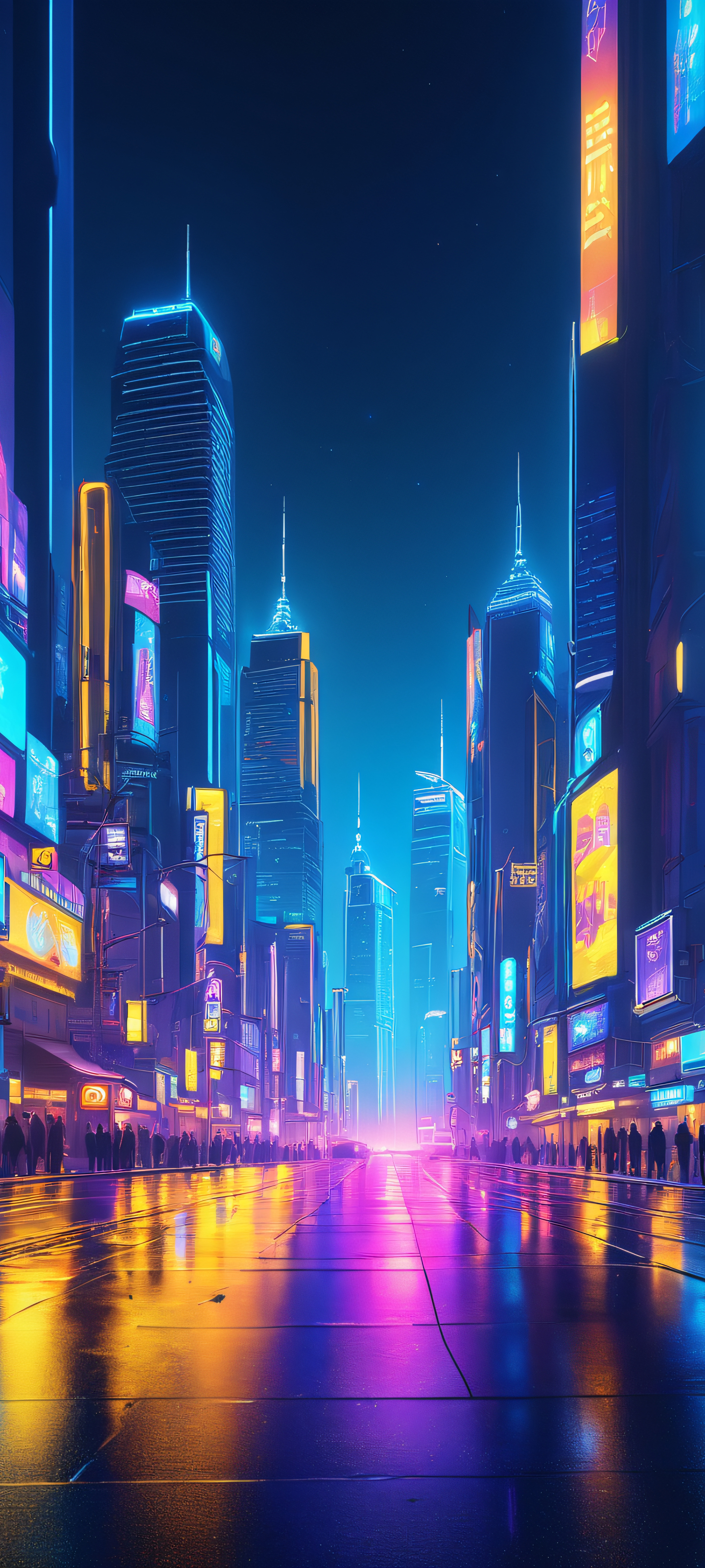 Elevate your mobile experience with this breathtaking vertical wallpaper. Perfectly optimized for iPhone, Samsung Galaxy, and Android home screens, this masterpiece features a realistic cityscape bathed in the warm glow of neon lights. Experience the beauty of nighttime in the city from the comfort of your own phone.