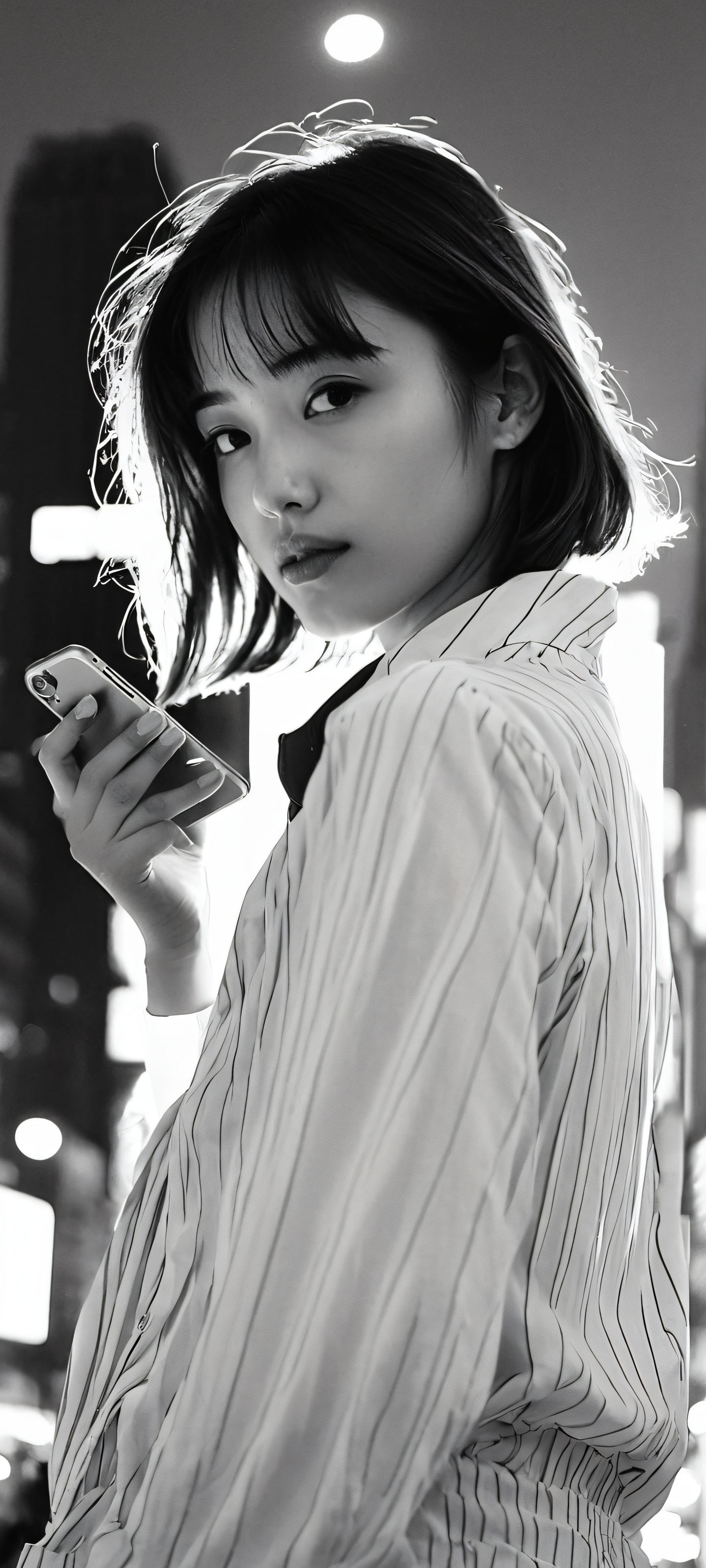 Vertical mobile phone wallpaper of a girl standing in front of a neon-lit cityscape at night, perfect for iPhone and Android devices.
