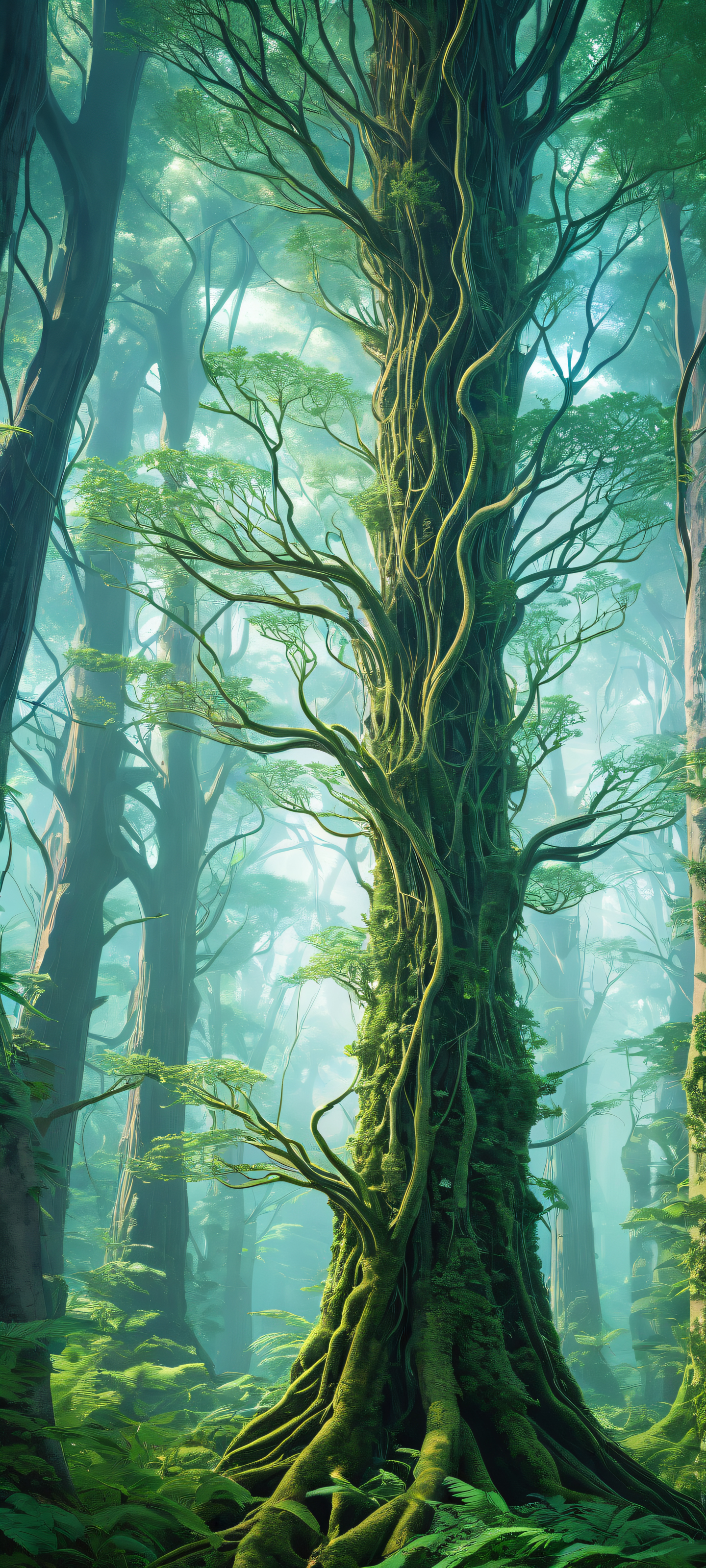 A breathtaking vertical portrait artwork of Microscopic Neuro-Forests placed in the lower-middle, intricate micro-details showcasing the mesmerizing structures of dendrite vines and nerve grass., A perfectly clean and empty top half with vast pure void, allowing for UI widgets to breathe comfortably, while the lower half descends into a surreal, vibrant alien forest., Award-winning digital art, pristine clarity with a focus on macrophotography-inspired visuals, blending seamlessly into an immersive biotech fantasy landscape., Ethereal lighting radiates from the surroundings, casting brilliant colors and subtle ray traced reflections across the neuro-forests, evoking a sense of wonder and discovery., A palette dominated by iridescent blues and greens, echoing the neural networks and bioluminescent organisms found within this surreal NeuroTerra landscape., ethereal lighting, radiant, brilliant colors, ray traced reflections, pristine clarity, portrait composition, centered subject in the lower middle, perfectly clean and smooth top half for UI, extreme depth of field blurred background, highly textured surfaces, intricate micro-details, physically based rendering, award-winning digital art, epic breathtaking scale, stunning visual impact, perfect composition, macOS wallpaper aesthetic, masterpiece, 2K QHD resolution, 9:20 aspect ratio.