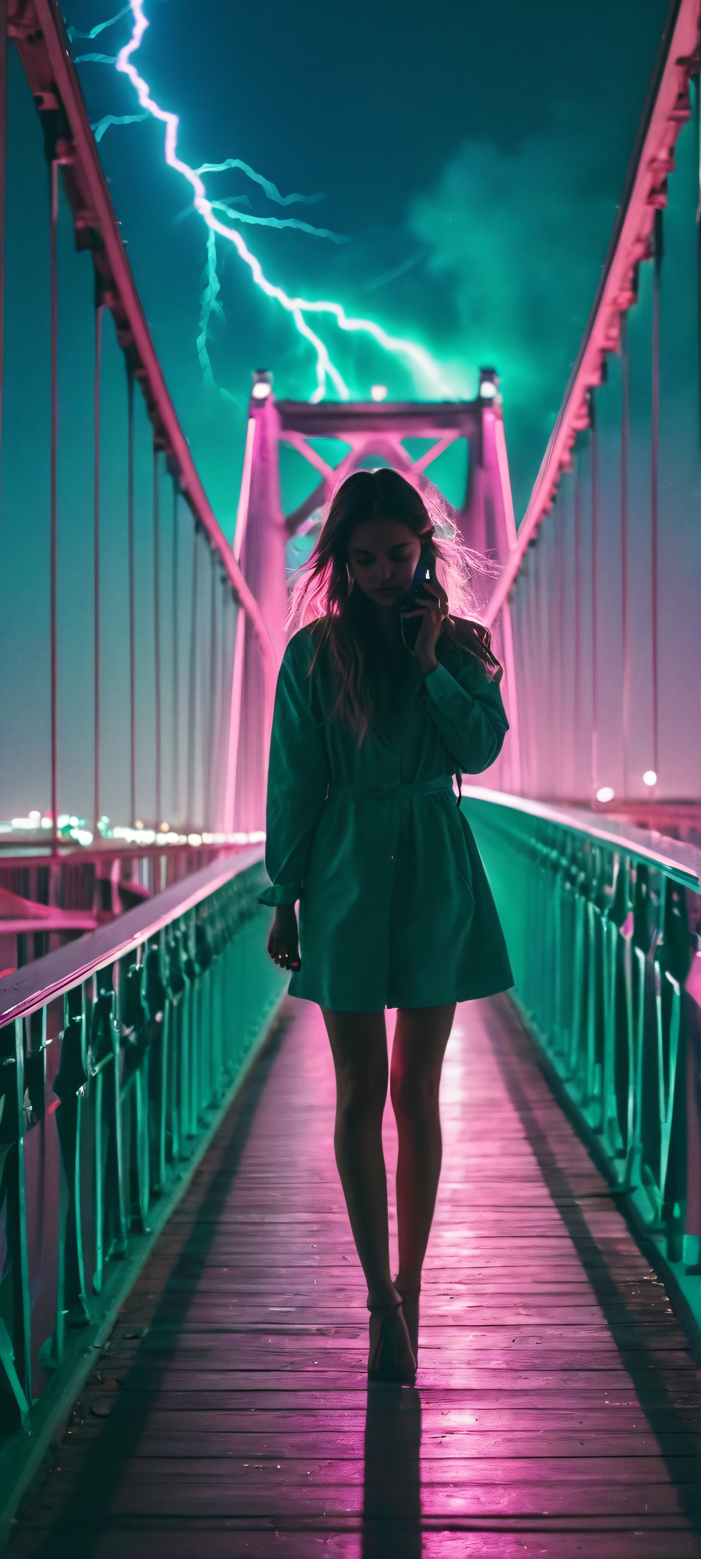 A serene 1girl moment on a bridge at night, lit by volumetric lightning, perfectly suited for iPhone/Android home screens.