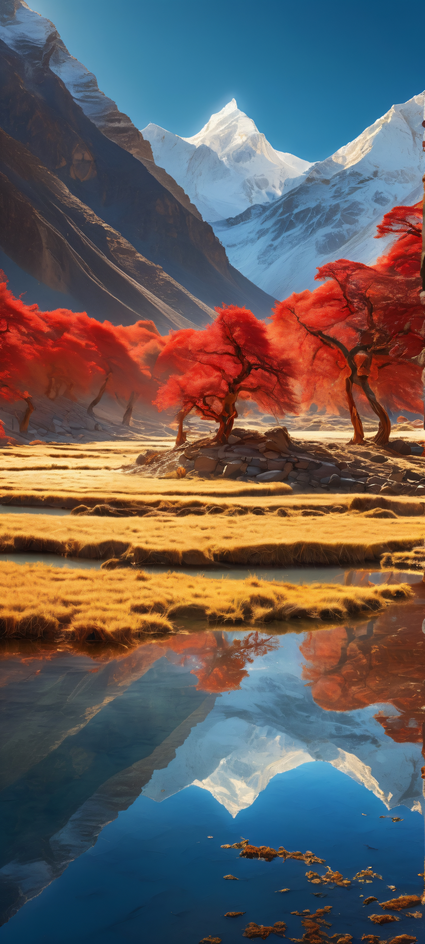 iPhone/Android users will love this breathtaking vertical mobile wallpaper featuring Om, a stunning Tibetan landscape with minimalist and colorful design. Perfectly optimized for home screens.