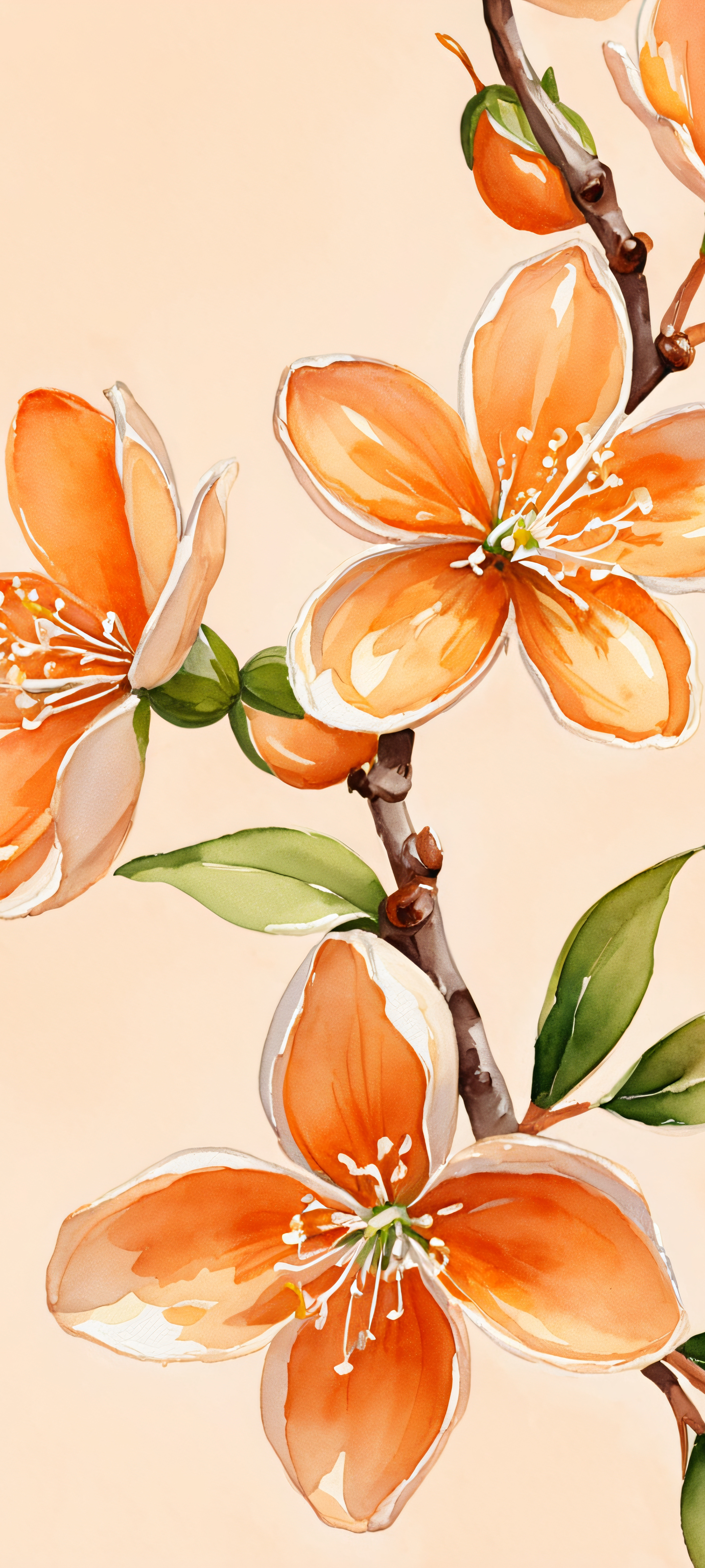 Elevate your iPhone, Samsung Galaxy, or Android home screen with this stunning Orange Blossom wallpaper, crafted with the finest watercolor techniques. Its soft, diffuse colors will transport you to a serene garden, where warm beige, soft peach, and rich orange hues blend in harmony.