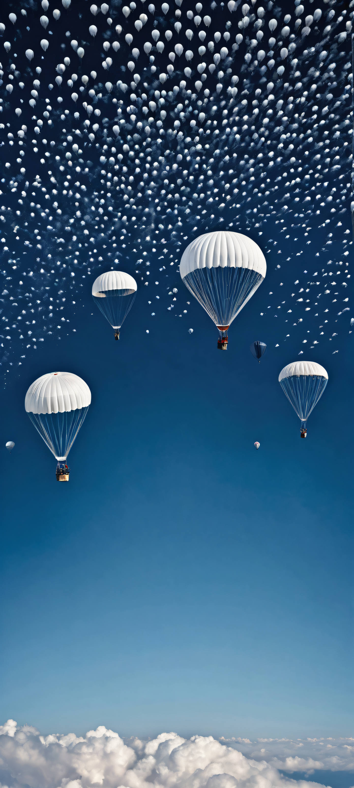 A breathtaking vertical portrait artwork of Parachutes placed in the lower-middle, intricate micro-details, Perfectly clean and empty top half with vast pure void, simply a blue background, Award-winning digital art, stunning visual impact, pristine clarity, Deep perfect blacks, striking crisp contrast, and elegant luminescent accents in dark mode aesthetic, Dominant colors of deep blues and whites, reminiscent of the night sky and clouds, elegant low-key lighting, deep perfect blacks, striking contrast, sleek dark mode aesthetic, luminescent accents, deep rich colors, portrait composition, centered subject in the lower middle, perfectly clean and smooth top half for UI, extreme depth of field blurred background, highly textured surfaces, intricate micro-details, physically based rendering, award-winning digital art, epic breathtaking scale, stunning visual impact, perfect composition, macOS wallpaper aesthetic, masterpiece, 2K QHD resolution, 9:20 aspect ratio.