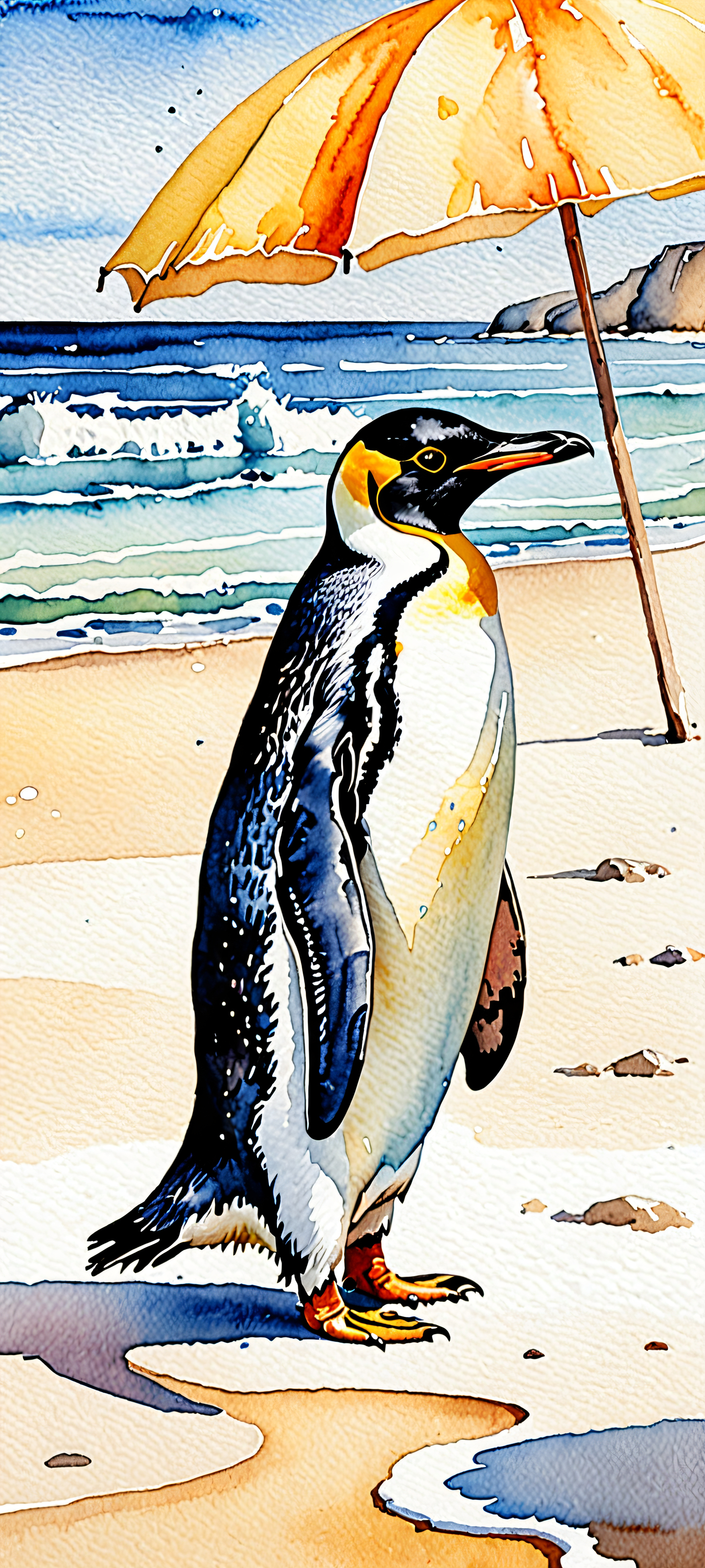 Step into a serene coastal haven with this stunning vertical mobile wallpaper, perfectly optimized for your iPhone, Samsung Galaxy, or Android home screen. This beautiful piece of digital art showcases a happy penguin basking in the warm sunshine, surrounded by vibrant blue and yellow hues that evoke feelings of relaxation and tranquility.