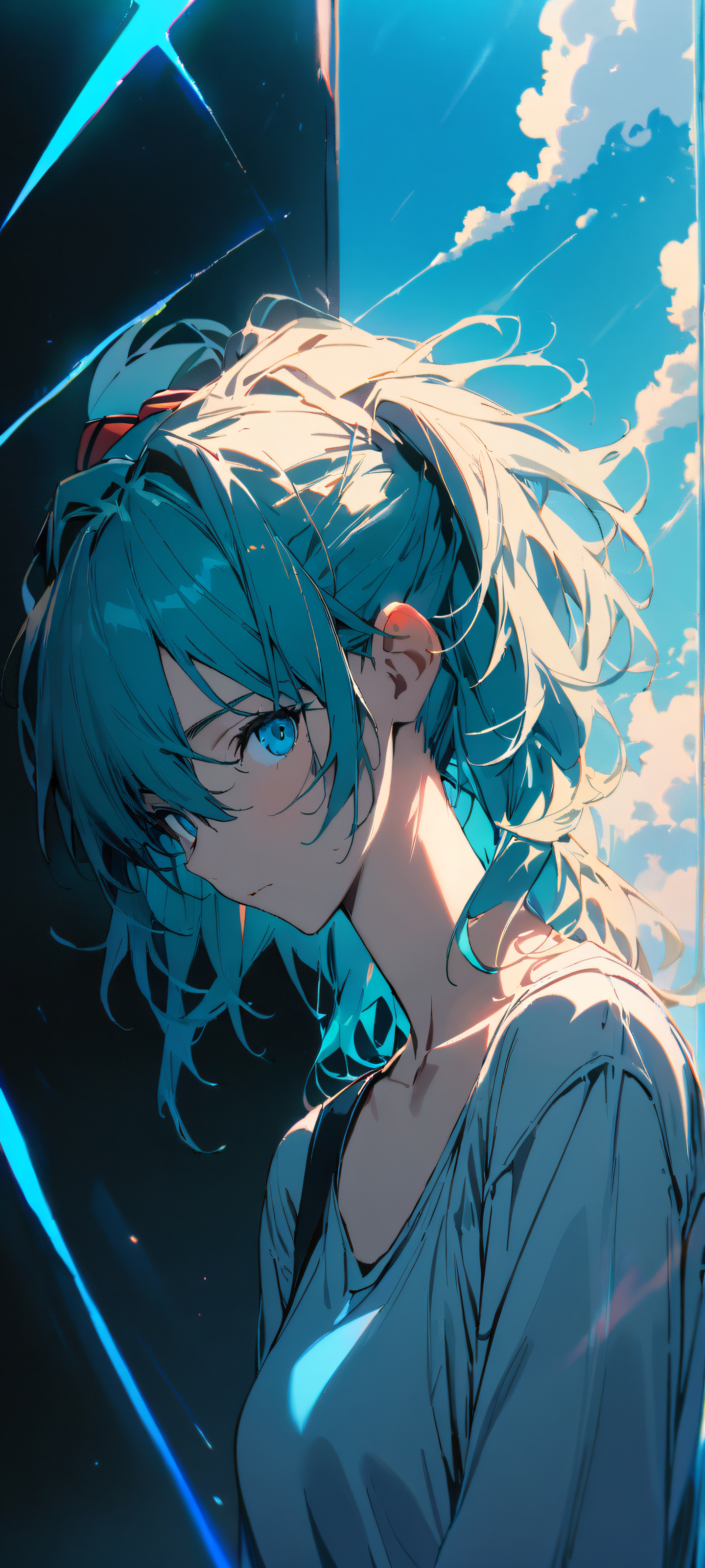 1girl, asuka langley soryu, neon genesis evangelion, solo, masterpiece, best quality, very aesthetic, absurdres, highly detailed, looking at viewer, portrait composition, centered subject in the lower middle, perfectly clean and smooth top half for UI, Perfectly clean and empty top half with vast pure void, gradually transitioning to a serene aqua-colored background with subtle gradient effects, Dominant palette of calming aqua blues, accented by vivid electric blue highlights from the guitar and Mikoto’s striking hair color, bright and airy, ethereal lighting, beautiful sky, cinematic lighting, vivid colors