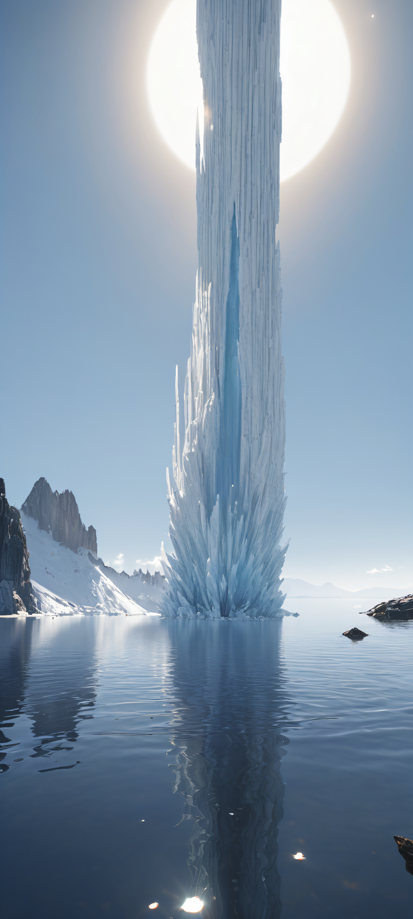 A breathtaking vertical portrait artwork of A massive black eclipse, radiating a chilling, intensely glowing pale-white corona, placed in the lower-middle with insane micro-details., Perfectly clean and empty top half with vast pure void, below, a dark tattered shroud covering a lone wanderer on a perfectly smooth, reflective frozen lake of black obsidian., Award-winning digital art, pristine clarity, and stunning visual impact., Ethereal lighting with radiant, brilliant colors, ray-traced reflections, and pristine clarity, casting an otherworldly glow., Dominant pale-white corona color palette with dark ash-filled gray tones and subtle hints of cold blue hues., ethereal lighting, radiant, brilliant colors, ray traced reflections, pristine clarity, portrait composition, centered subject in the lower middle, perfectly clean and smooth top half for UI, extreme depth of field blurred background, highly textured surfaces, intricate micro-details, physically based rendering, award-winning digital art, epic breathtaking scale, stunning visual impact, perfect composition, macOS wallpaper aesthetic, masterpiece, 2K QHD resolution, 9:20 aspect ratio.
