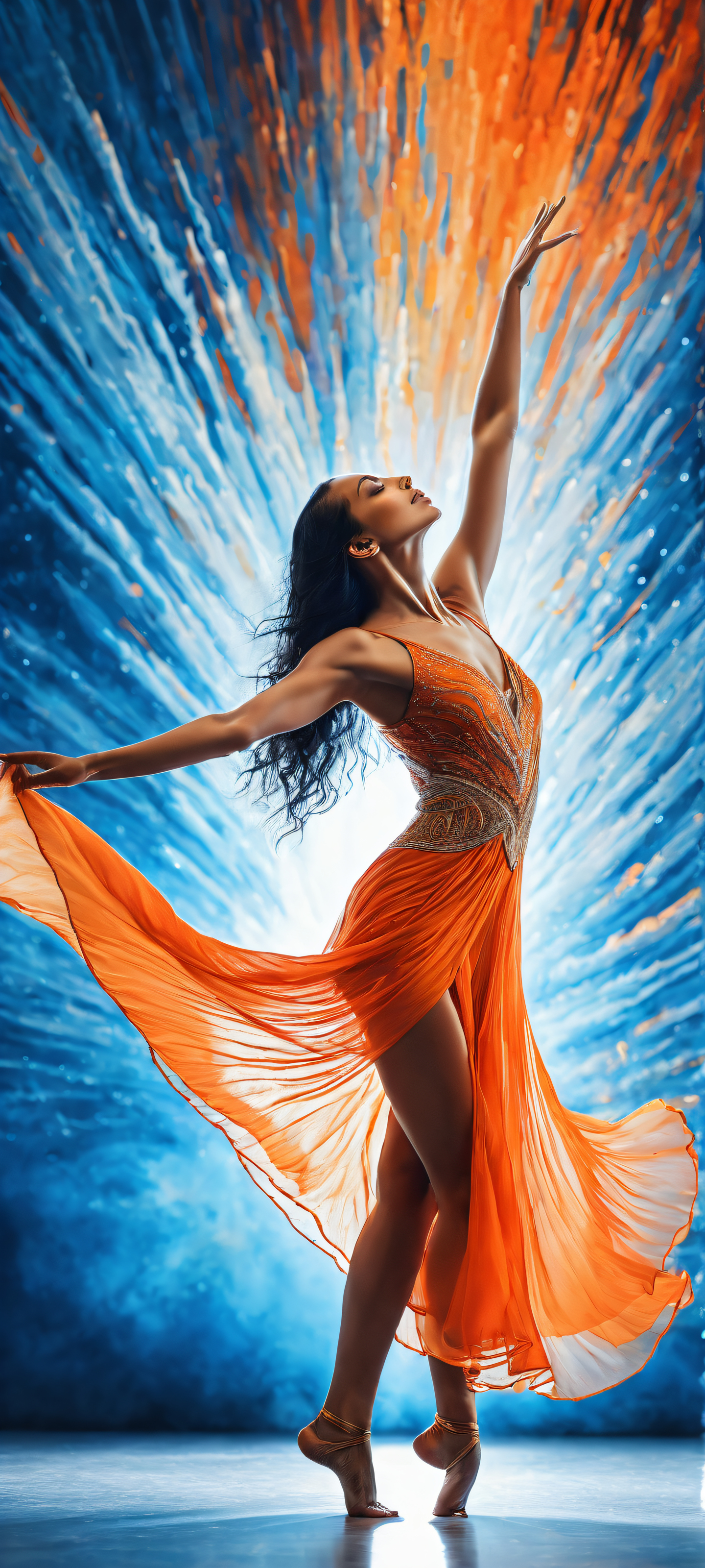 A breathtaking vertical portrait artwork of A graceful dancer in motion, placed in the lower-middle with insane micro-details., Perfectly clean and empty top half with vast pure void, contrasting with a dynamic abstract background featuring splashes of blue and orange paint., Award-winning digital art, stunning visual impact, and pristine clarity., Ethereal lighting with radiant, brilliant colors, ray-traced reflections, and unparalleled clarity, as if the dancer is bathed in an otherworldly glow., Dominant palette of blues and oranges, with touches of white, evoking a sense of dynamism and energy., ethereal lighting, radiant, brilliant colors, ray traced reflections, pristine clarity, portrait composition, centered subject in the lower middle, perfectly clean and smooth top half for UI, extreme depth of field blurred background, highly textured surfaces, intricate micro-details, physically based rendering, award-winning digital art, epic breathtaking scale, stunning visual impact, perfect composition, macOS wallpaper aesthetic, masterpiece, 2K QHD resolution, 9:20 aspect ratio.