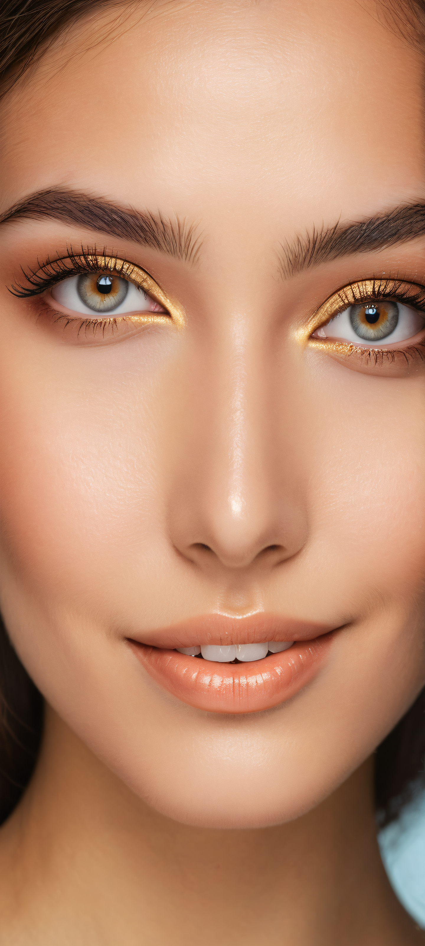 A breathtaking vertical portrait artwork of A stunning girl placed in the lower-middle with intricate micro-details on her eyelashes and beautiful eyes, smiling directly at the viewer., Perfectly clean and empty top half, with a vast pure void of space for UI widgets to breathe. The bottom half showcases a serene background., Award-winning digital art with stunning visual impact, featuring pristine clarity and exceptional texture., Ethereal lighting with radiant, brilliant colors, subtle ray traced reflections, and flawless clarity, creating a bright and airy atmosphere., Warm golden brown hues, complemented by soft pastel shades, evoking feelings of serenity and tranquility., ethereal lighting, radiant, brilliant colors, ray traced reflections, pristine clarity, portrait composition, centered subject in the lower middle, perfectly clean and smooth top half for UI, extreme depth of field blurred background, highly textured surfaces, intricate micro-details, physically based rendering, award-winning digital art, epic breathtaking scale, stunning visual impact, perfect composition, macOS wallpaper aesthetic, masterpiece, 2K QHD resolution, 9:20 aspect ratio.