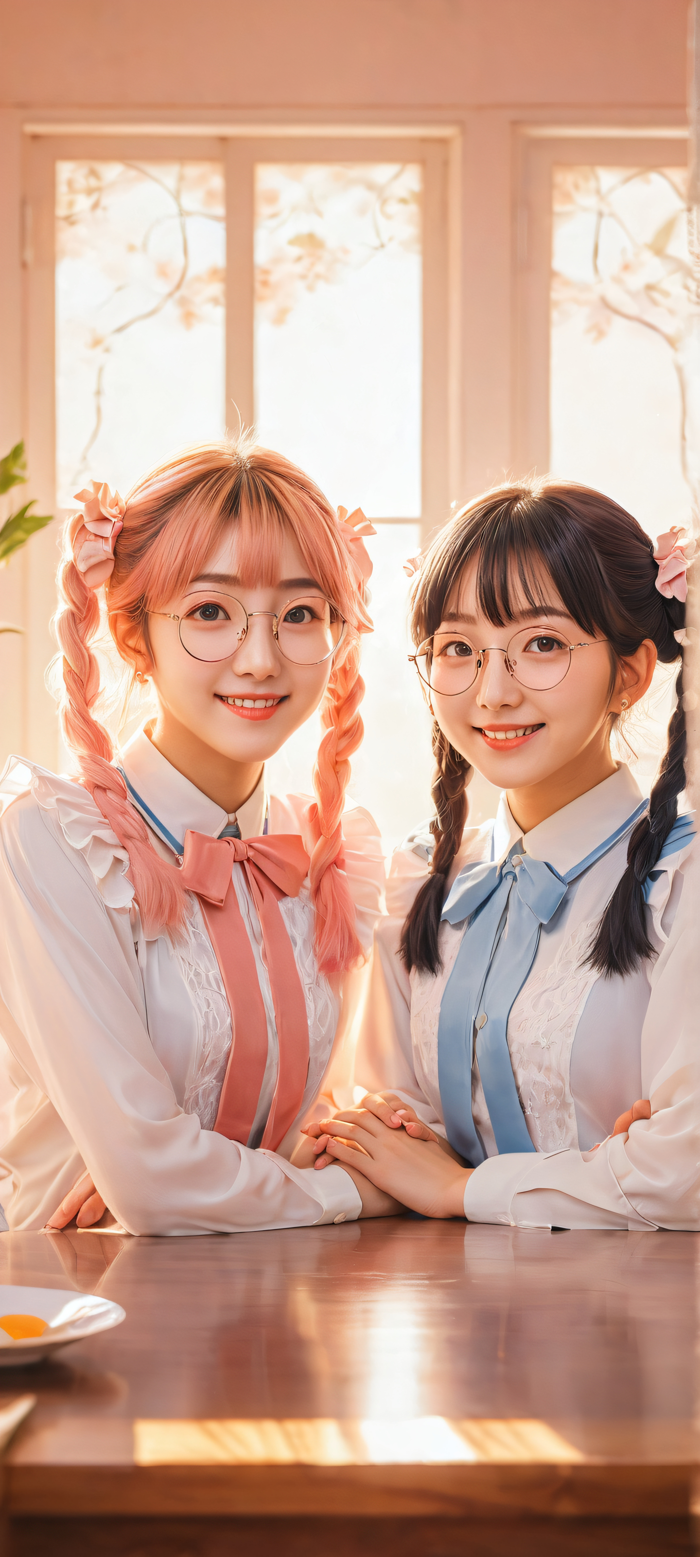 A breathtaking vertical portrait artwork of Two anime girls, Junpaku Karen and her friend, placed in the lower-middle with intricate micro-details of their glasses and twintails, looking back at the viewer with smiling faces., A perfectly clean and empty top half with vast pure void, allowing for unobstructed UI breathing space, seamlessly transitioning to a warm and cozy indoor setting with a table where the girls are eating., Award-winning digital art, stunning visual impact, and pristine clarity, reminiscent of a masterpiece, suitable for an epic desktop wallpaper., Ethereal lighting with radiant and brilliant colors, featuring ray-traced reflections and impeccable clarity, as if lit by soft sunbeams streaming through windows., [‘Pastel Pink’, ‘Creamy White’, ‘Soft Peach’], ethereal lighting, radiant, brilliant colors, ray traced reflections, pristine clarity, portrait composition, centered subject in the lower middle, perfectly clean and smooth top half for UI, extreme depth of field blurred background, highly textured surfaces, intricate micro-details, physically based rendering, award-winning digital art, epic breathtaking scale, stunning visual impact, perfect composition, macOS wallpaper aesthetic, masterpiece, 2K QHD resolution, 9:20 aspect ratio.