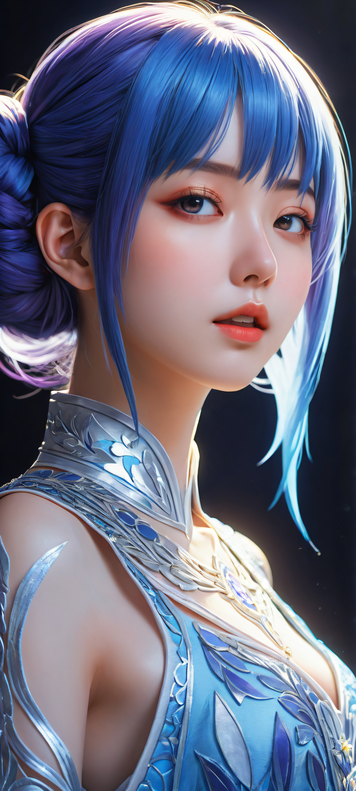 A breathtaking vertical portrait artwork of Anime Girl placed in the lower-middle with intricate micro-details on her face and virtual youtuber attire, singing with closed eyes while holding a microphone, Perfectly clean and empty top half with vast pure void, giving way to a black background that provides a striking contrast to the vibrant anime girl below, Award-winning digital art, pristine clarity, and stunning visual impact, reminiscent of an epic desktop wallpaper masterpiece, Ethereal lighting with radiant, brilliant colors and ray-traced reflections, bathing the scene in a bright and airy atmosphere, Dominant blue hue with touches of dark blues and purples, echoing the vibrant blue hair of the anime girl, ethereal lighting, radiant, brilliant colors, ray traced reflections, pristine clarity, portrait composition, centered subject in the lower middle, perfectly clean and smooth top half for UI, extreme depth of field blurred background, highly textured surfaces, intricate micro-details, physically based rendering, award-winning digital art, epic breathtaking scale, stunning visual impact, perfect composition, macOS wallpaper aesthetic, masterpiece, 2K QHD resolution, 9:20 aspect ratio.