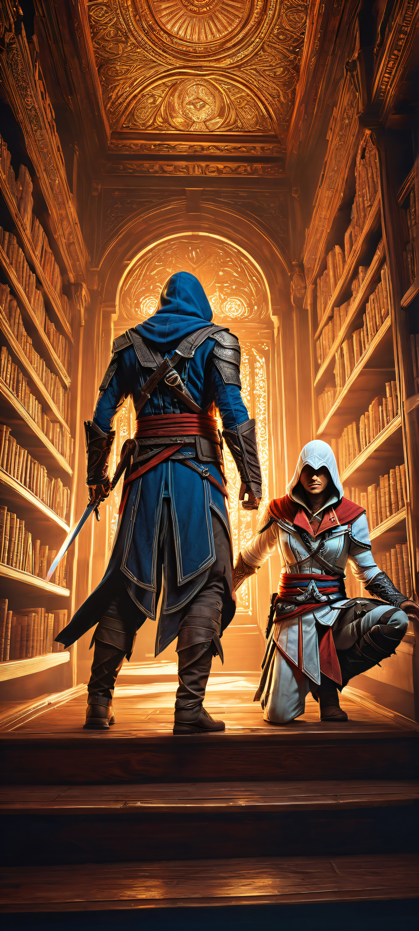 A breathtaking vertical portrait artwork of Two Assassin’s Creed characters, placed in the lower-middle with insane micro-details and intricate sword designs., Perfectly clean and empty top half with vast pure void, descending into a meticulously crafted library scene with ornate wooden shelves and subtle ambient lighting., Award-winning digital art, stunning visual impact, and pristine clarity, reminiscent of high-end concept art., Etéreo, radiant, and brilliant, with ray-traced reflections casting an otherworldly glow on the characters’ armor and surroundings., Dominant palette of rich blues and golds, evoking a sense of mystery and adventure, with accents of deep crimson and polished wood tones., ethereal lighting, radiant, brilliant colors, ray traced reflections, pristine clarity, portrait composition, centered subject in the lower middle, perfectly clean and smooth top half for UI, extreme depth of field blurred background, highly textured surfaces, intricate micro-details, physically based rendering, award-winning digital art, epic breathtaking scale, stunning visual impact, perfect composition, macOS wallpaper aesthetic, masterpiece, 2K QHD resolution, 9:20 aspect ratio.