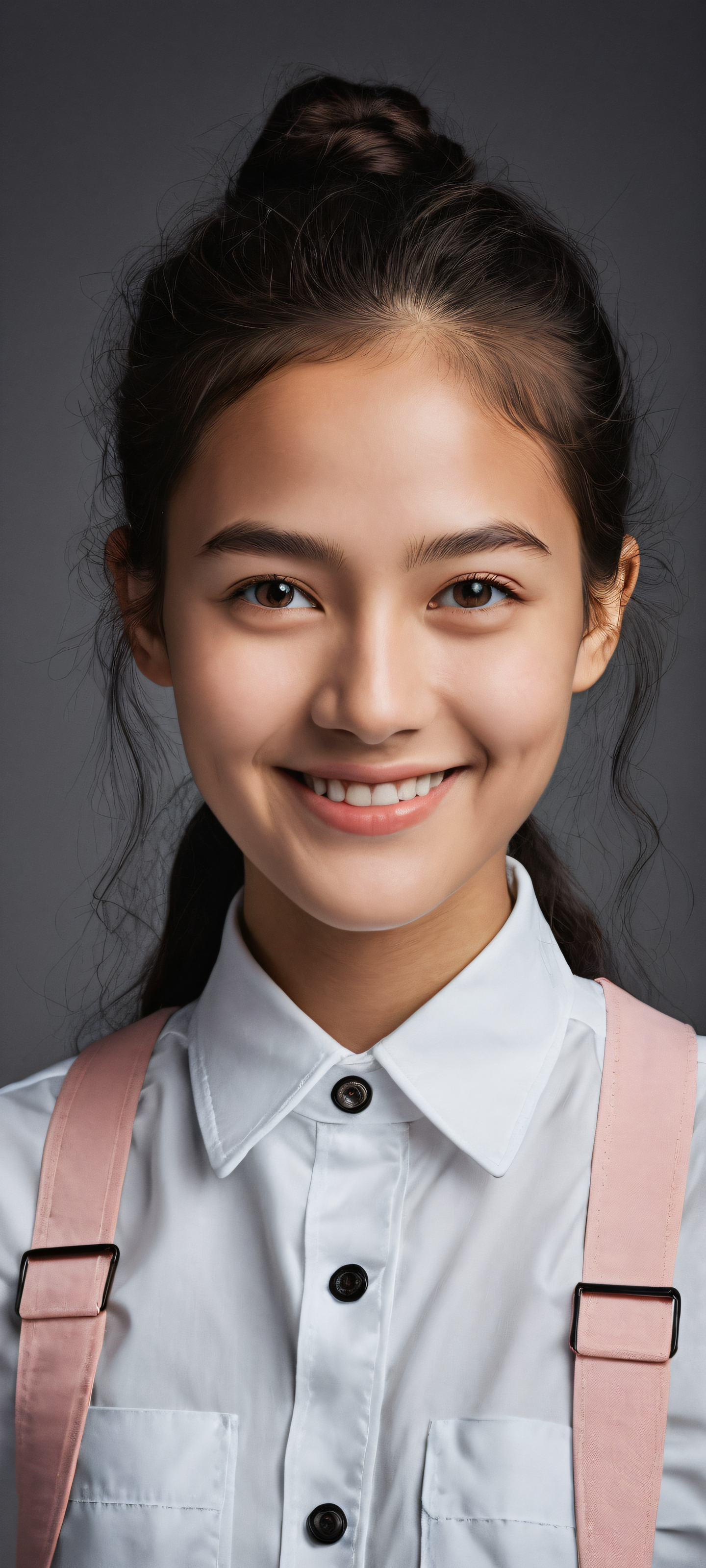 A breathtaking vertical portrait artwork of A smiling schoolgirl in a crisp white uniform, placed in the lower-middle with insane micro-details showcasing the intricate textures of her clothing and accessories., Perfectly clean and empty top half with vast pure void, giving way to a serene and intimate setting that puts the subject at center stage., Award-winning digital art, pristine clarity, and stunning visual impact, reminiscent of a masterpiece worthy of the highest praise., Deep perfect blacks, striking crisp contrast, and elegant luminescent accents create a sleek dark mode aesthetic, inviting the viewer’s gaze., Soft pastel hues of pink and peach subtly complemented by warm gray tones, evoking a sense of gentle elegance and refined sophistication., elegant low-key lighting, deep perfect blacks, striking contrast, sleek dark mode aesthetic, luminescent accents, deep rich colors, portrait composition, centered subject in the lower middle, perfectly clean and smooth top half for UI, extreme depth of field blurred background, highly textured surfaces, intricate micro-details, physically based rendering, award-winning digital art, epic breathtaking scale, stunning visual impact, perfect composition, macOS wallpaper aesthetic, masterpiece, 2K QHD resolution, 9:20 aspect ratio.