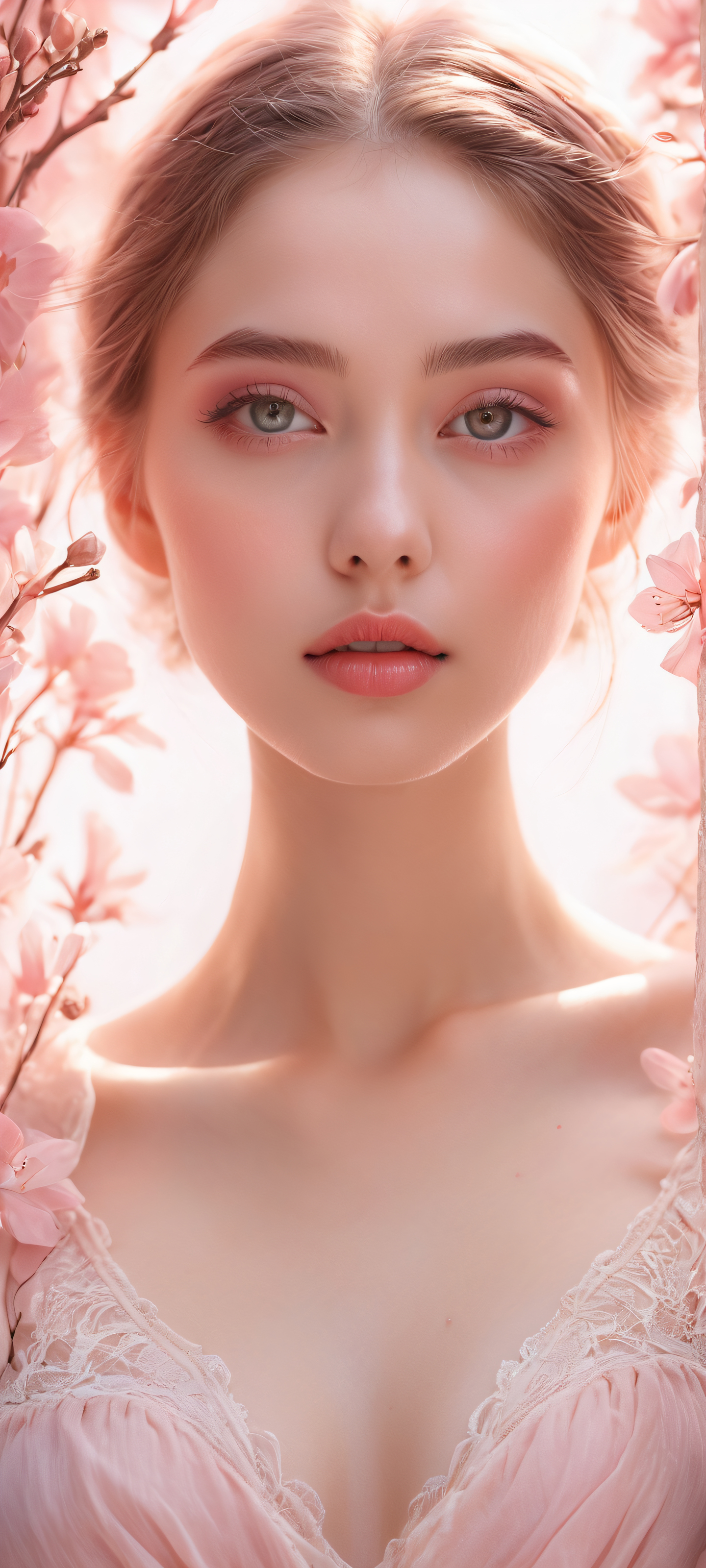 A breathtaking vertical portrait artwork of A girl placed in the lower-middle with intricate micro-details of her surroundings, such as delicate fabrics and subtle facial expressions., Perfectly clean and empty top half with vast pure void above, allowing for a sense of limitless possibility., Award-winning digital art, stunning visual impact with a focus on precision and clarity., Cinematic lighting with volumetric effects that create depth and dimensionality, as well as subtle ray traced reflections., Pastel pink hues with delicate white accents, evoking feelings of serenity and gentle wonder., ethereal lighting, radiant, brilliant colors, ray traced reflections, pristine clarity, portrait composition, centered subject in the lower middle, perfectly clean and smooth top half for UI, extreme depth of field blurred background, highly textured surfaces, intricate micro-details, physically based rendering, award-winning digital art, epic breathtaking scale, stunning visual impact, perfect composition, macOS wallpaper aesthetic, masterpiece, 2K QHD resolution, 9:20 aspect ratio.