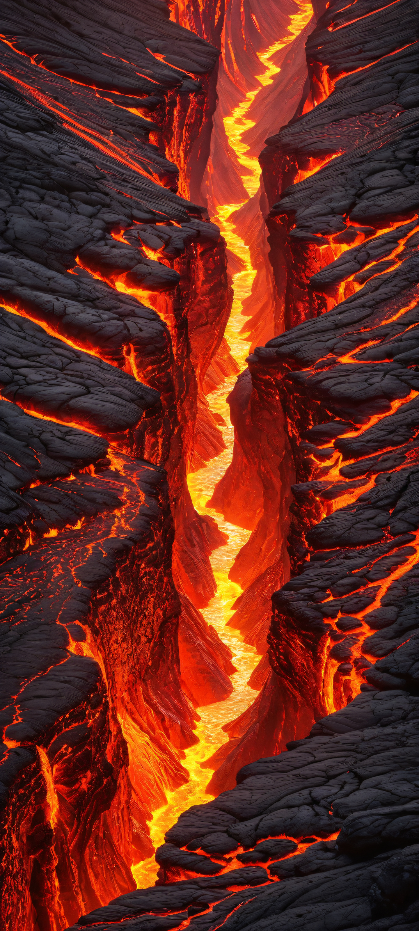 A breathtaking vertical portrait artwork of A majestic lava flow placed in the lower-middle with insane micro-details, showcasing intricate textures and patterns., Perfectly clean and empty top half with vast pure void, gradually transitioning to a fiery lava landscape below., Award-winning digital art, pristine clarity, and stunning visual impact, reminiscent of National Geographic’s iconic photography. , Ethereal lighting with radiant red hues and brilliant reflections, as if the sun itself has descended upon the scene, casting an otherworldly glow., #FFC080, ethereal lighting, radiant, brilliant colors, ray traced reflections, pristine clarity, portrait composition, centered subject in the lower middle, perfectly clean and smooth top half for UI, extreme depth of field blurred background, highly textured surfaces, intricate micro-details, physically based rendering, award-winning digital art, epic breathtaking scale, stunning visual impact, perfect composition, macOS wallpaper aesthetic, masterpiece, 2K QHD resolution, 9:20 aspect ratio.