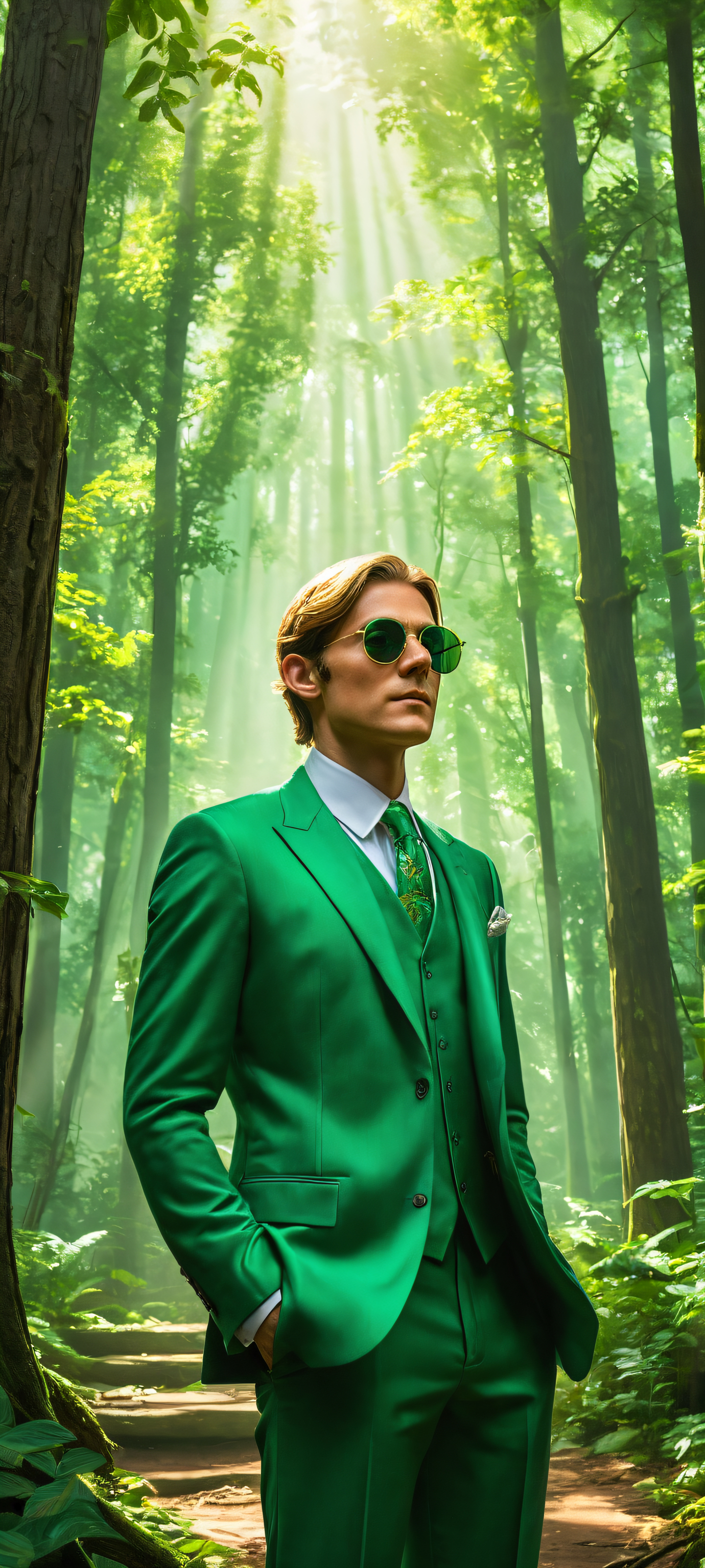 A breathtaking vertical portrait artwork of Link, placed in the lower-middle, intricate micro-details of his sunglasses and pinstripe suit, with Skull Kids peeking from behind trees., Perfectly clean and empty top half with vast pure void, while the Lost Woods’ mystical aura fills the lower half with towering trees, lush foliage, and glinting shafts of green light., Award-winning digital art, pristine clarity, with stunning visual impact and a hint of playfulness., Ethereal lighting with radiant, brilliant colors, ray-traced reflections, and a bright, airy quality that captures the whimsical essence of this magical transaction., #34C759 (a vibrant green) dominates the palette, complemented by Link’s pinstripe suit, the dark wood tones of the kiosk, and the mystical green light shafts., ethereal lighting, radiant, brilliant colors, ray traced reflections, pristine clarity, portrait composition, centered subject in the lower middle, perfectly clean and smooth top half for UI, extreme depth of field blurred background, highly textured surfaces, intricate micro-details, physically based rendering, award-winning digital art, epic breathtaking scale, stunning visual impact, perfect composition, macOS wallpaper aesthetic, masterpiece, 2K QHD resolution, 9:20 aspect ratio.