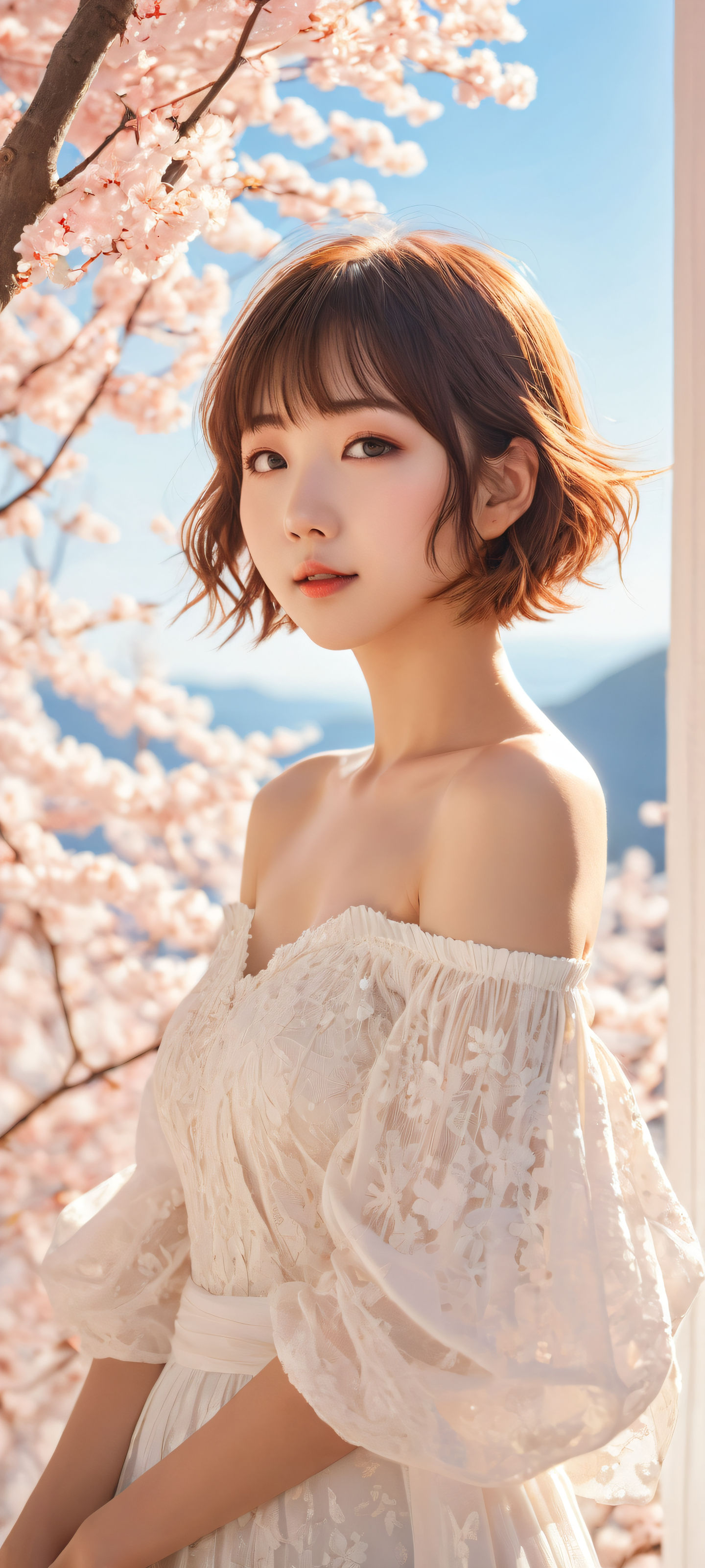 A breathtaking vertical portrait artwork of Kuriyama Mirai, placed in the lower-middle with insane micro-details of her short hair and off-shoulder attire, radiating love., Perfectly clean and empty top half with vast pure void, seamlessly transitioning into a serene anime-inspired background featuring Kanbara Akihito in the distance., Award-winning digital art, stunning visual impact, with breathtaking 8k resolution and pristine clarity., Ethereal sunlight casting a warm glow on Mirai’s delicate features, with ray-traced reflections adding depth to her stunning off-shoulder attire., Dominant color palette of soft pastels and radiant golden hues, evoking feelings of love and serenity., ethereal lighting, radiant, brilliant colors, ray traced reflections, pristine clarity, portrait composition, centered subject in the lower middle, perfectly clean and smooth top half for UI, extreme depth of field blurred background, highly textured surfaces, intricate micro-details, physically based rendering, award-winning digital art, epic breathtaking scale, stunning visual impact, perfect composition, macOS wallpaper aesthetic, masterpiece, 2K QHD resolution, 9:20 aspect ratio.
