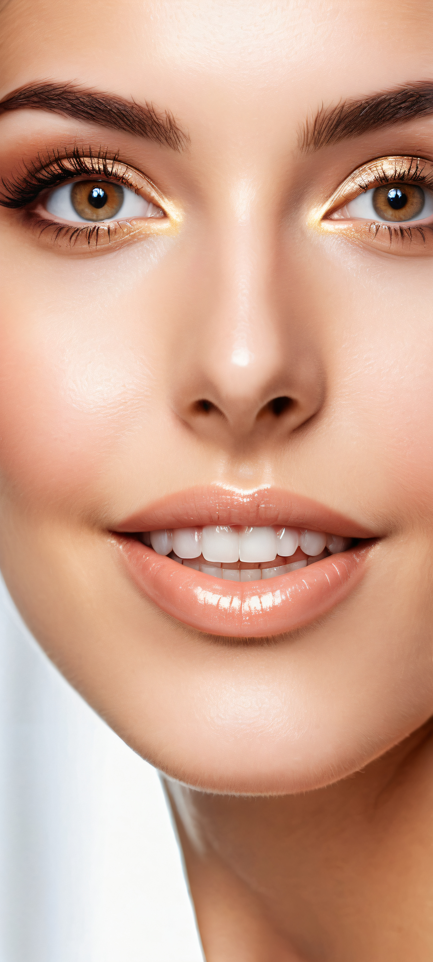A breathtaking vertical portrait artwork of A captivating woman’s face placed in the lower-middle with insane micro-details focusing on her beautiful brown eyes and eyelashes, smile directed at the viewer., Perfectly clean and empty top half with vast pure void above, while the rest of the background remains subtly blurred to emphasize the subject’s majestic presence., Award-winning digital art with stunning visual impact, featuring breathtakingly real and pristine clarity., Ethereal lighting with radiant and brilliant colors, featuring ray-traced reflections that create a sense of depth and dimensionality. The overall effect is bright and airy, inviting the viewer to step into the scene., Warm, earthy tones dominate the palette, with brown and beige hues complemented by soft pinks and creamy whites., ethereal lighting, radiant, brilliant colors, ray traced reflections, pristine clarity, portrait composition, centered subject in the lower middle, perfectly clean and smooth top half for UI, extreme depth of field blurred background, highly textured surfaces, intricate micro-details, physically based rendering, award-winning digital art, epic breathtaking scale, stunning visual impact, perfect composition, macOS wallpaper aesthetic, masterpiece, 2K QHD resolution, 9:20 aspect ratio.