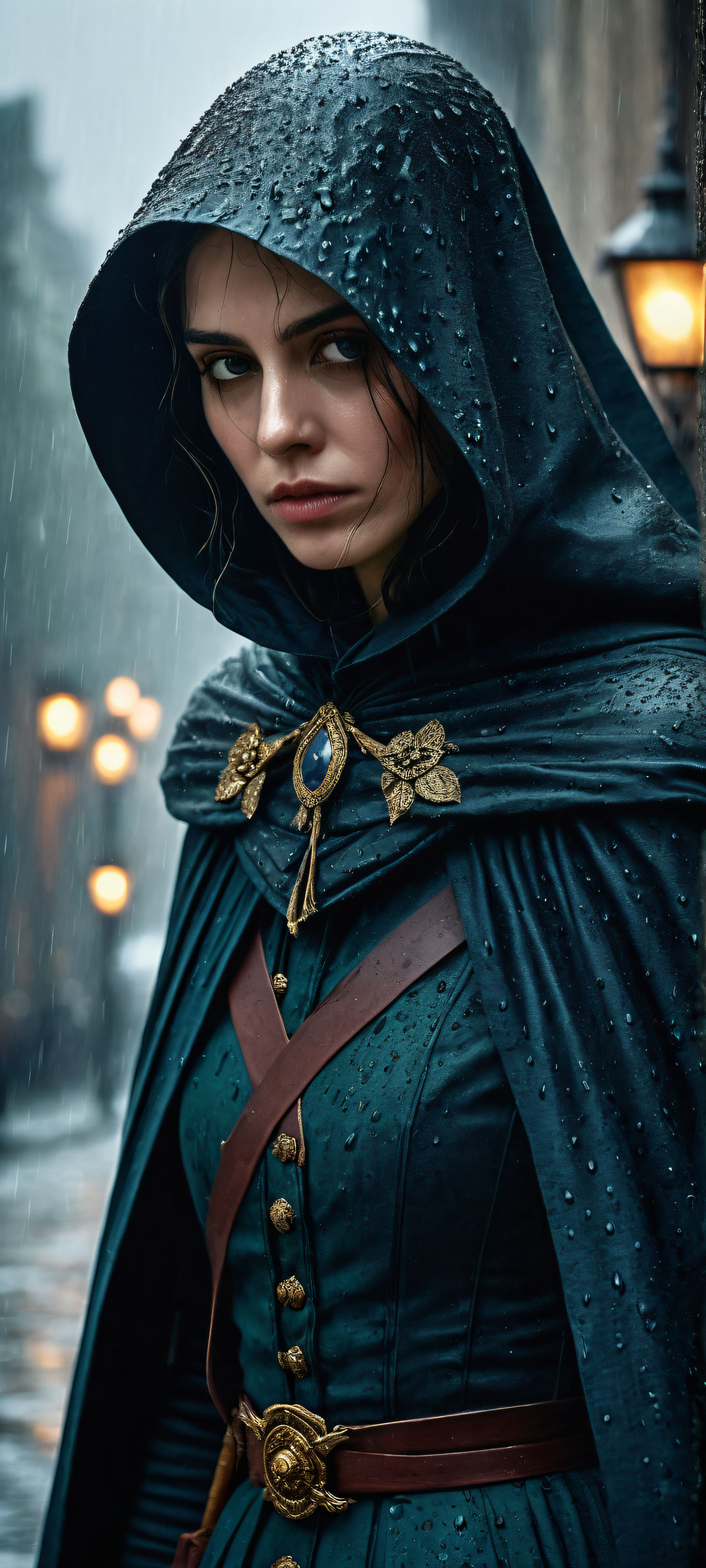 A breathtaking vertical portrait artwork of A melancholic 1800s masked hero with a sad face, placed in the lower-middle with intricate micro-details, showcasing small natural breasts sagging slightly and a cape flowing in the rain, with a hand resting on her rapier in the scabbard., A perfectly clean and empty top half with vast pure void, allowing for unobstructed visual exploration of the subject, while the bottom half is shrouded in a misty rain., Award-winning digital art, pristine clarity, with a focus on textures and subtle shading to create an immersive experience., Deep perfect blacks dominate the scene, punctuated by striking crisp contrast between light and dark, with elegant luminescent accents simulating the soft glow of rain-soaked city streets., A muted palette of deep blues, grays, and greens, evoking a sense of melancholy and mystery., elegant low-key lighting, deep perfect blacks, striking contrast, sleek dark mode aesthetic, luminescent accents, deep rich colors, portrait composition, centered subject in the lower middle, perfectly clean and smooth top half for UI, extreme depth of field blurred background, highly textured surfaces, intricate micro-details, physically based rendering, award-winning digital art, epic breathtaking scale, stunning visual impact, perfect composition, macOS wallpaper aesthetic, masterpiece, 2K QHD resolution, 9:20 aspect ratio.