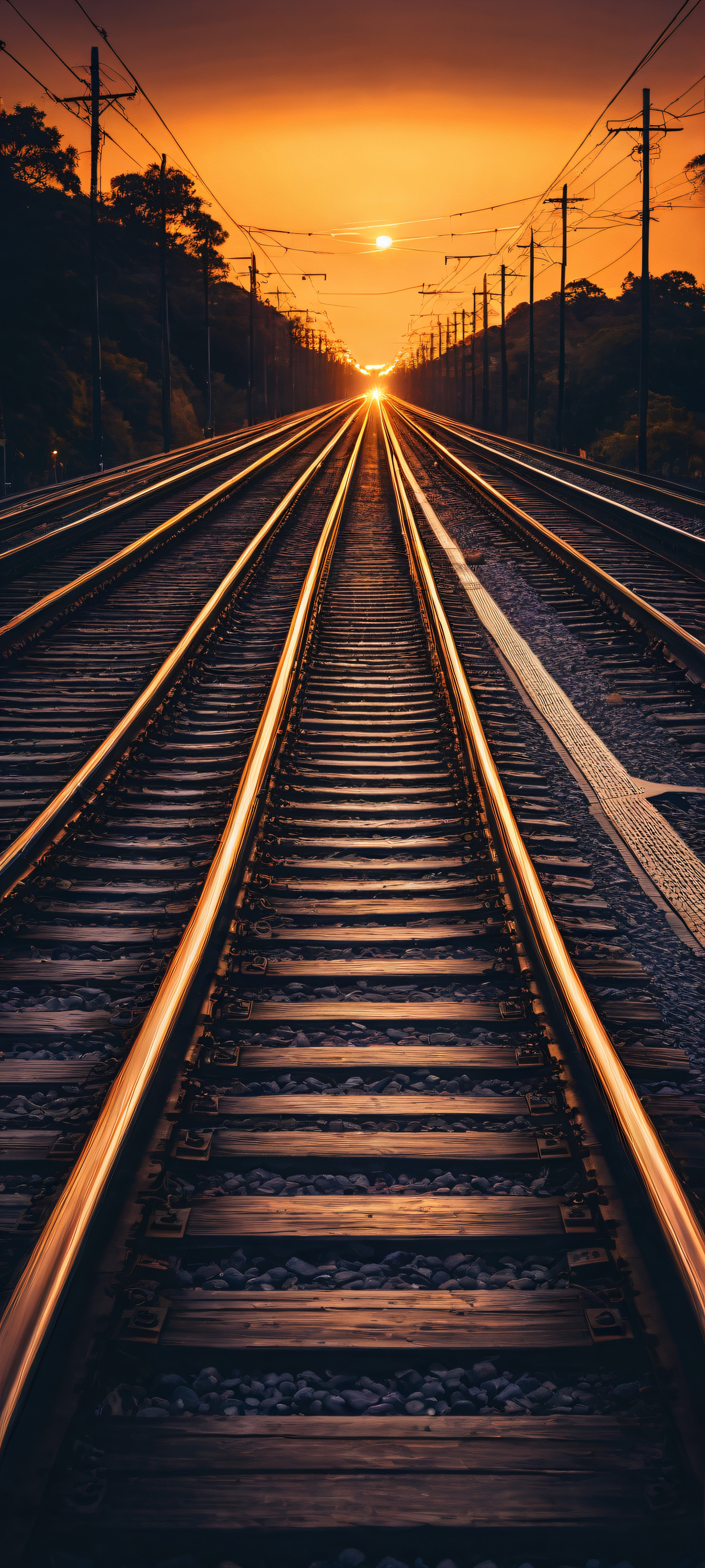 Experience the breathtaking combination of deep blues, purples, and warm yellow hues in this stunning vertical portrait artwork. Perfeitamente otimizado para o seu iPhone, Galáxia Samsung, ou tela inicial do Android, this masterpiece is sure to leave a lasting impression with its flawless dark mode aesthetic and luminescent accents. The intricate motion blur and micro-details of the railway tracks add an extra layer of visual interest.