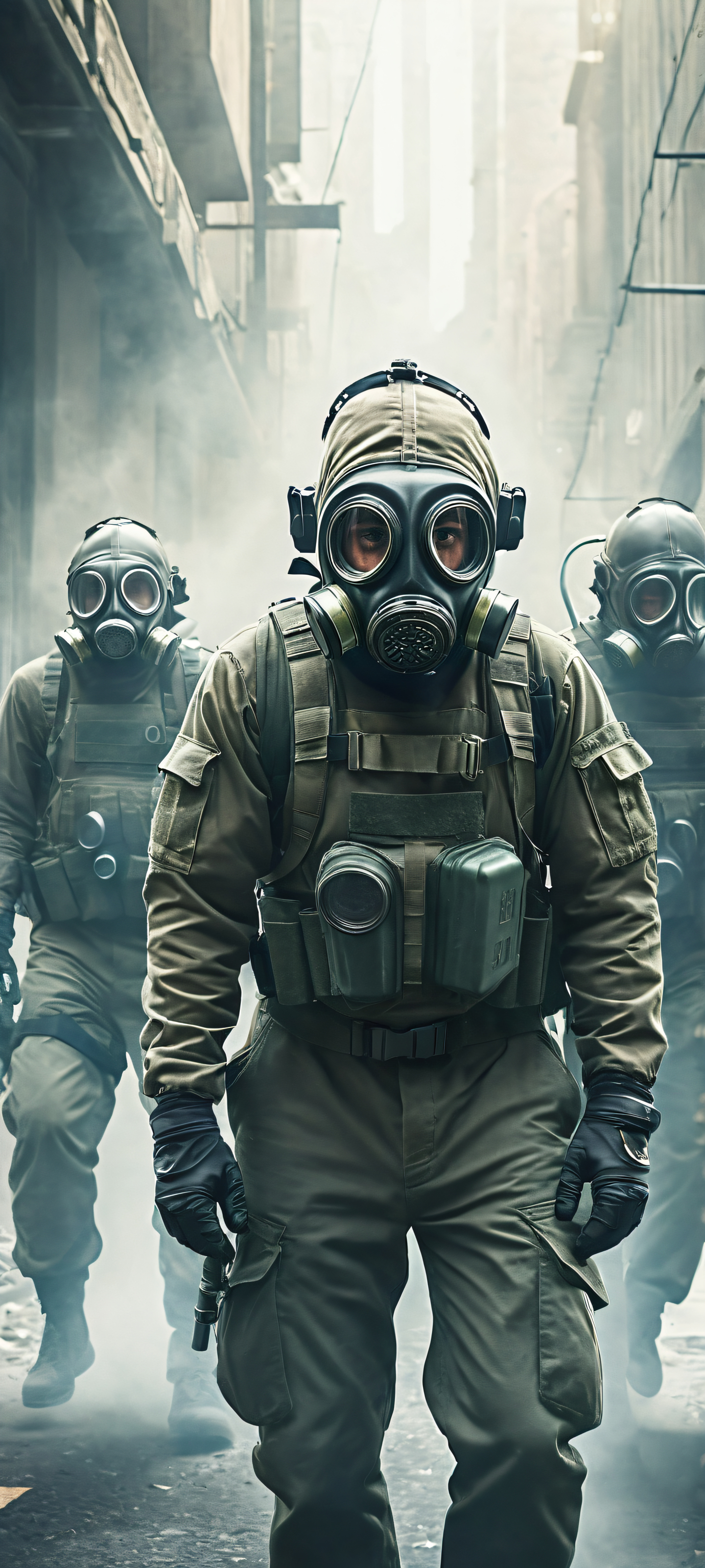 A breathtaking vertical portrait artwork of Men placed in the lower-middle, intricate micro-details of gas masks and squatting, with short sleeves and short hair., Perfectly clean and empty top half with vast pure void, contrasting with the dynamic action below., Award-winning digital art, pristine clarity, and a touch of minimalist simplicity., Etéreo, radiant lighting with brilliant colors, ray-traced reflections, and impeccable clarity, evoking a sense of otherworldliness., #3498DB #F7D2C4 #1ABC9C #3B3F54, ethereal lighting, radiant, brilliant colors, ray traced reflections, pristine clarity, portrait composition, centered subject in the lower middle, perfectly clean and smooth top half for UI, extreme depth of field blurred background, highly textured surfaces, intricate micro-details, physically based rendering, award-winning digital art, epic breathtaking scale, stunning visual impact, perfect composition, macOS wallpaper aesthetic, masterpiece, 2K QHD resolution, 9:20 aspect ratio.