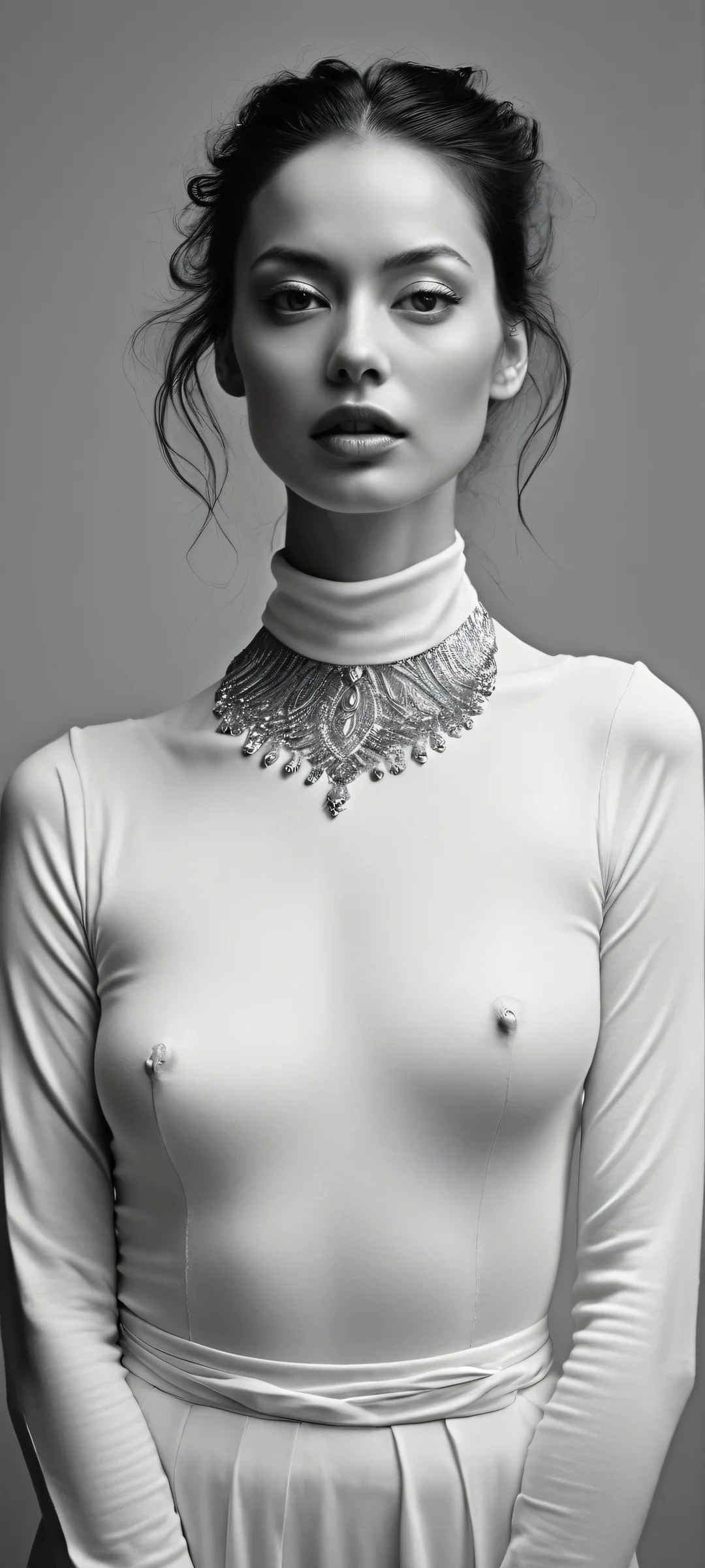 Experience the masterpiece on your perfectly optimized iPhone, Galáxia Samsung, ou tela inicial do Android. This award-winning digital art features a centered subject in the lower middle, surrounded by a vast pure void above. The ethereal lighting and ray-traced reflections create a bright and airy ambiance, while the muted Grays and subtle White highlights add depth and nuance.