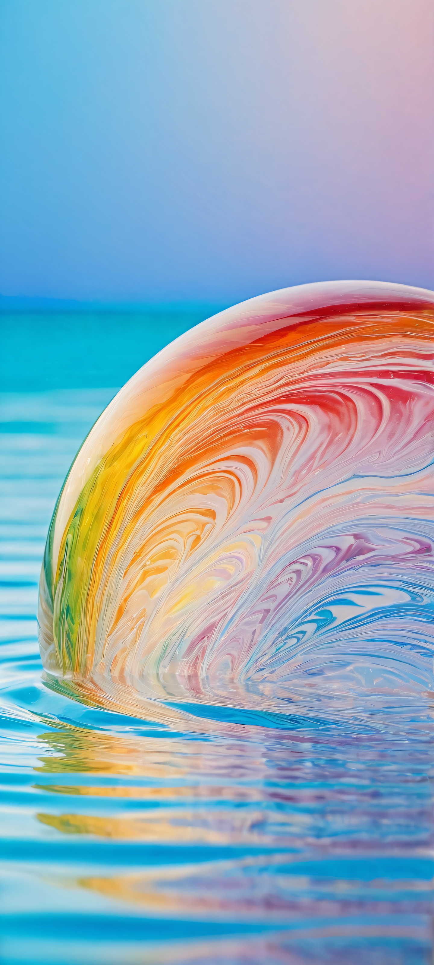 A breathtaking vertical portrait artwork of A colorful glass marble with a vibrant rainbow inside, placed in the lower-middle with insane micro-details. The glass is translucent, allowing the soft ripples of the surrounding water to create a mesmerizing interplay., A perfectly clean and empty top half with vast pure void, providing ample space for UI widgets. The background features a serene aquatic setting with gentle waves and soft foam, gradually giving way to the mesmerizing sight of the marble’s descent into the water., Award-winning digital art, stunning visual impact, and pristine clarity, showcasing exceptional attention to detail., Ethereal lighting with radiant, brilliant colors, showcasing a warm glow emanating from within the glass marble as it falls through the crystal-clear water. The light is diffused by the water’s surface tension, creating an otherworldly ambiance., #FF99CC, #33CCCC, #66CCCC, #0000FF, ethereal lighting, radiant, brilliant colors, ray traced reflections, pristine clarity, portrait composition, centered subject in the lower middle, perfectly clean and smooth top half for UI, extreme depth of field blurred background, highly textured surfaces, intricate micro-details, physically based rendering, award-winning digital art, epic breathtaking scale, stunning visual impact, perfect composition, macOS wallpaper aesthetic, masterpiece, 2K QHD resolution, 9:20 aspect ratio.