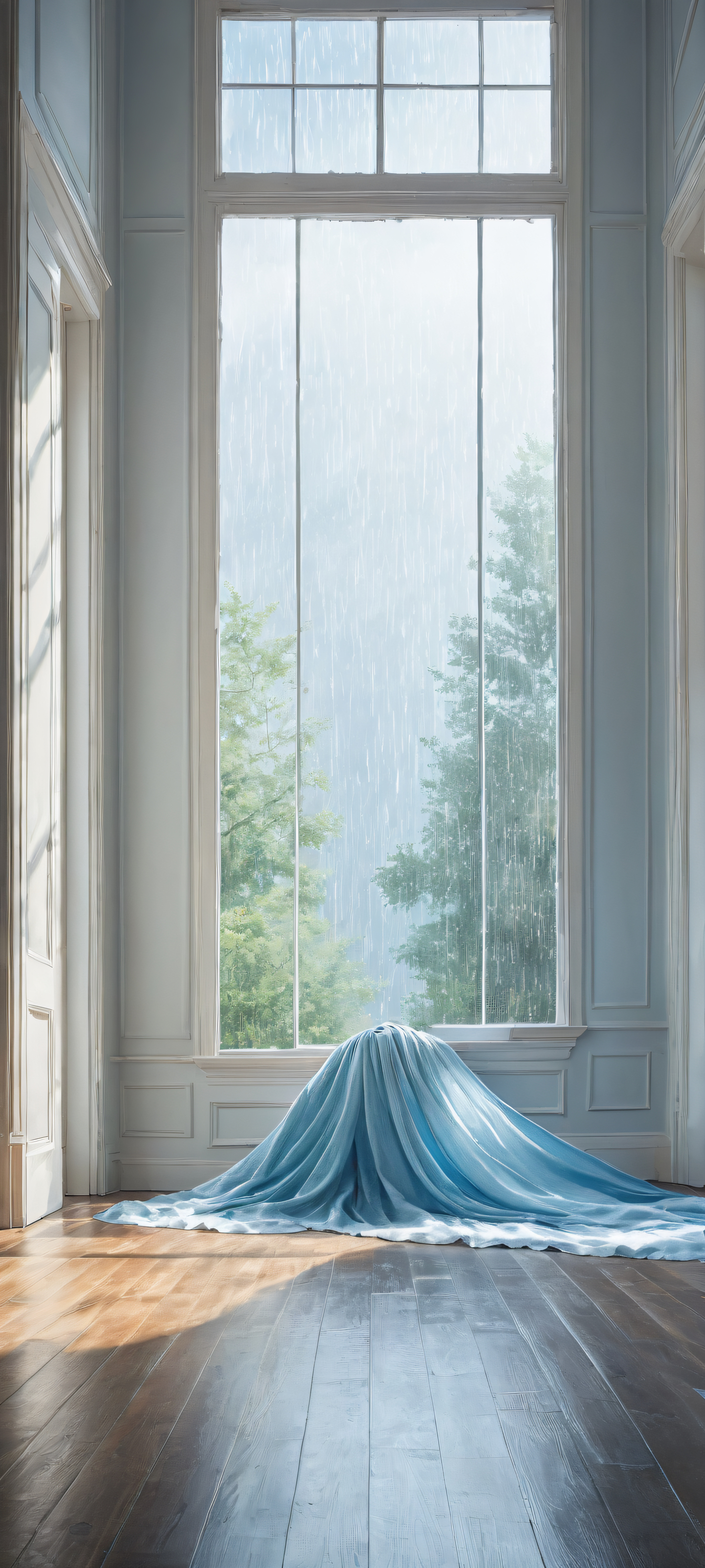 A breathtaking vertical portrait artwork of Ditto placed in the lower-middle, intricate micro-details, waiting for its trainer with a single tear dropping from its eye., A dimly lit room with a vast pure void above, perfectly clean and empty top half, contrasting the melancholic atmosphere below, where Ditto awaits its trainer in an abandoned training room., Award-winning digital art, stunning visual impact, perfectly blending modern watercolor techniques with pristine clarity., Ethereal lighting with soft, grayish-blue tones, casting a warm glow on the scene, as if the rain outside is seeping into the room through the window., #8B9467 #4F5154 #6495ED, ethereal lighting, radiant, brilliant colors, ray traced reflections, pristine clarity, portrait composition, centered subject in the lower middle, perfectly clean and smooth top half for UI, extreme depth of field blurred background, highly textured surfaces, intricate micro-details, physically based rendering, award-winning digital art, epic breathtaking scale, stunning visual impact, perfect composition, macOS wallpaper aesthetic, masterpiece, 2K QHD resolution, 9:20 aspect ratio.