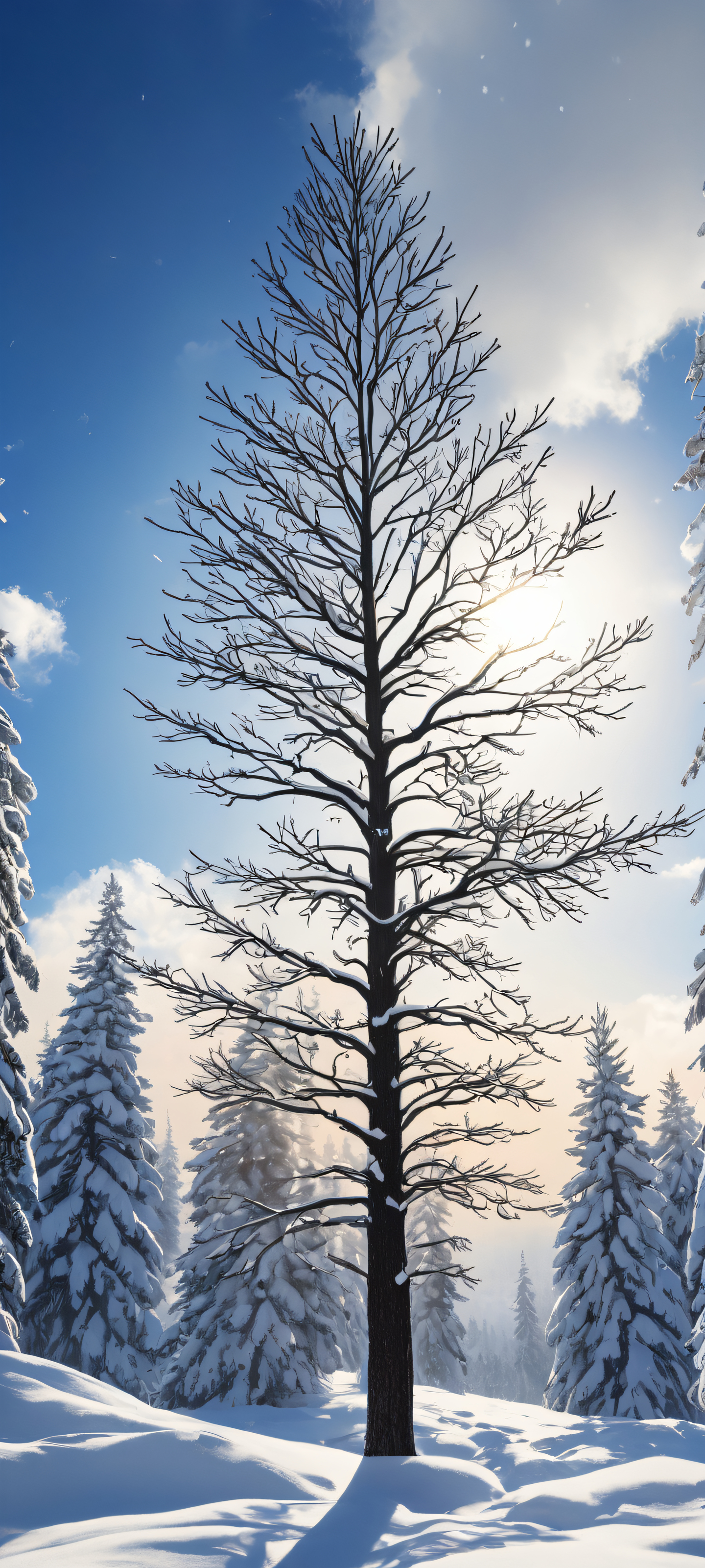 Perfeitamente otimizado para iPhone, Galáxia Samsung, e telas iniciais do Android, this breathtaking vertical portrait artwork combines intricate micro-details of snowflakes with serene winter landscapes. The result is a masterpiece that exudes elegance and visual impact, reminiscent of stunning 8K resolution. Enjoy the crisp contrast and luminescent accents on the snow-capped trees and clouds.