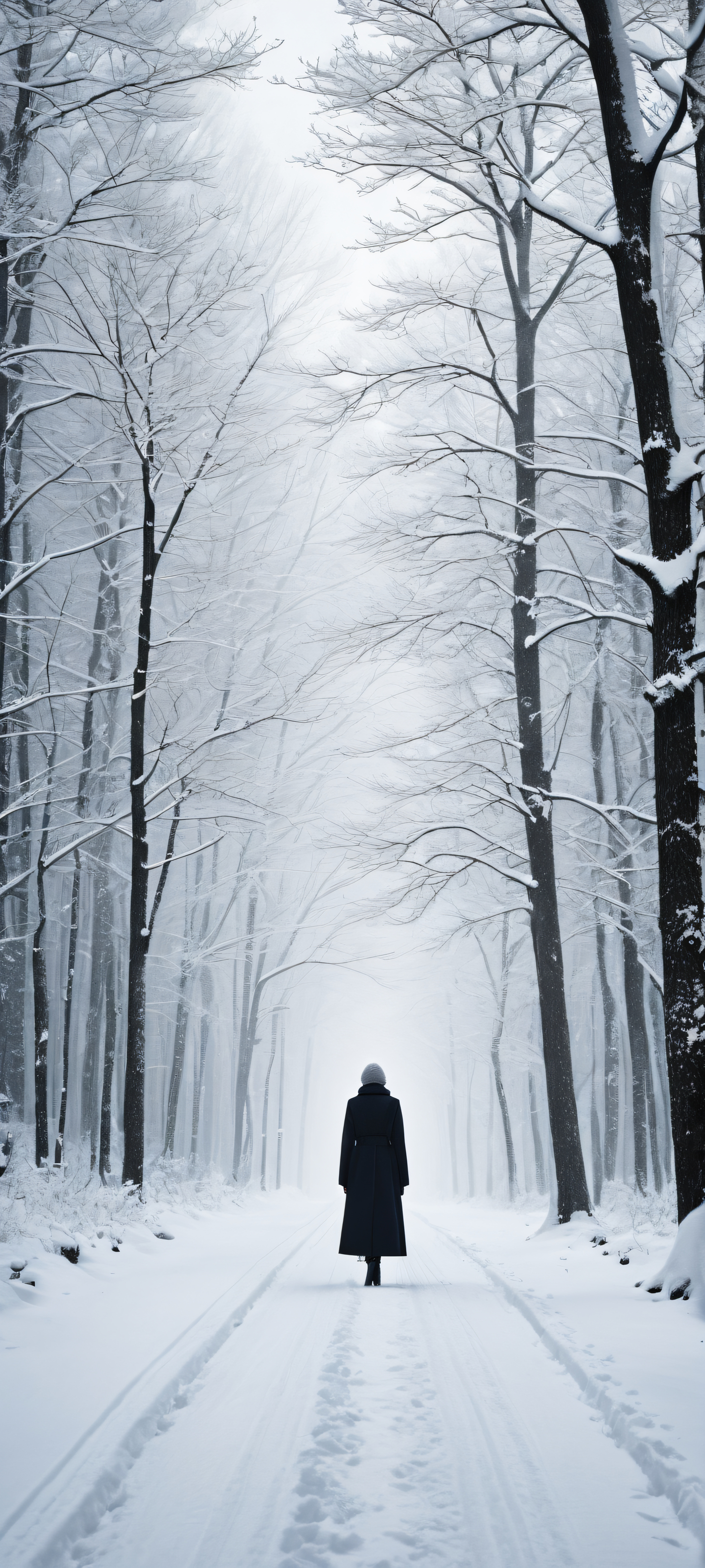 A breathtaking vertical portrait artwork of A solitary woman in a long black coat stands placed in the lower-middle, intricate micro-details of snow-dusted road, her head bowed amidst a desolate winter forest., The background features a perfectly clean and empty top half with vast pure void, giving way to the desolate winter forest below, devoid of any distractions or clutter., Award-winning digital art with stunning visual impact and pristine clarity, reminiscent of film noir, cinematic in scope., Ethereal lighting with soft, warm tones, capturing the essence of a snowy night, where the only illumination comes from the moon’s gentle glow, casting long shadows across the snow-covered terrain., Dominant colors include a palette of deep blues and greys, punctuated by splashes of crisp white, evoking a sense of melancholy and introspection, characteristic of a winter morning., ethereal lighting, radiant, brilliant colors, ray traced reflections, pristine clarity, portrait composition, centered subject in the lower middle, perfectly clean and smooth top half for UI, extreme depth of field blurred background, highly textured surfaces, intricate micro-details, physically based rendering, award-winning digital art, epic breathtaking scale, stunning visual impact, perfect composition, macOS wallpaper aesthetic, masterpiece, 2K QHD resolution, 9:20 aspect ratio.