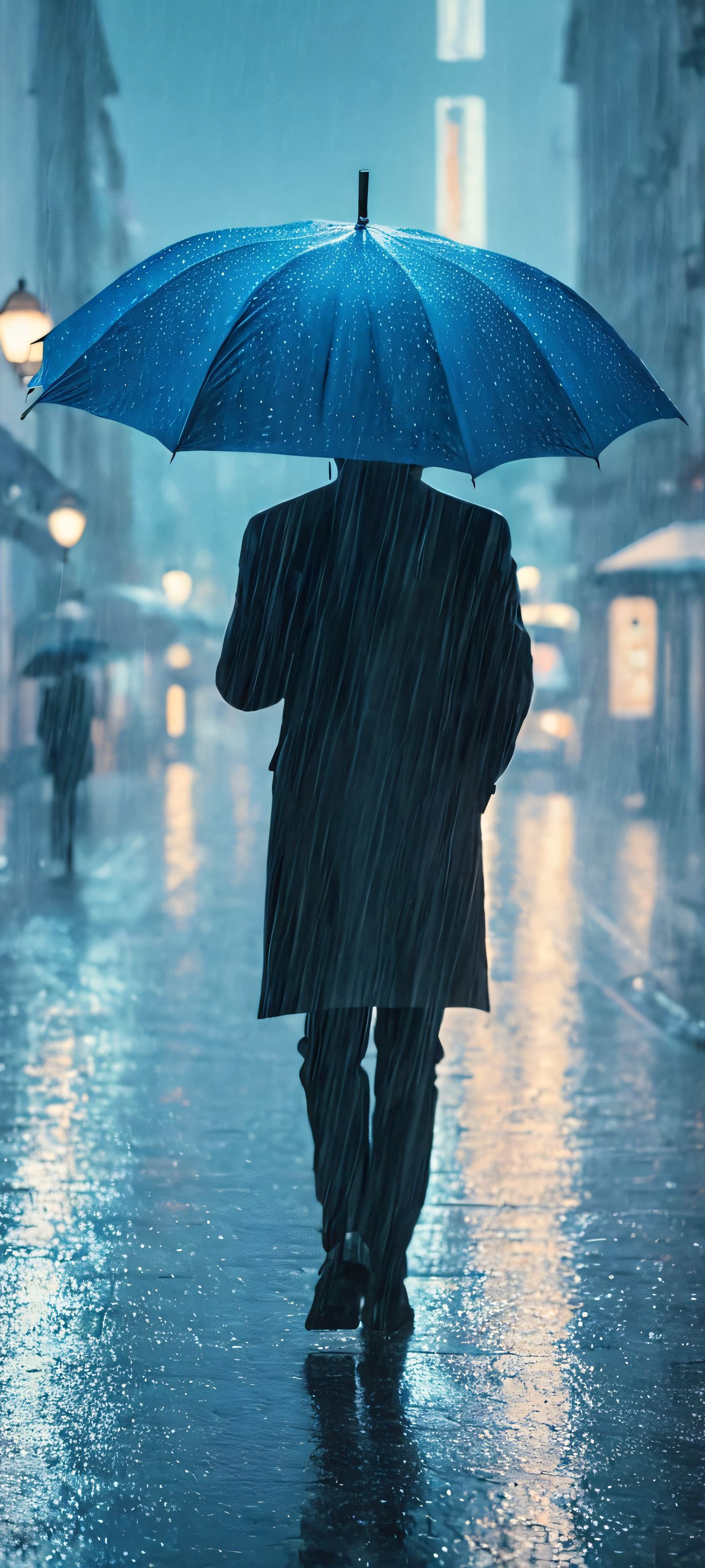 Add a touch of drama to your home screen with this stunning 2K QHD vertical wallpaper. Perfectly optimized for iPhone, Samsung Galaxy, and Android devices, this masterpiece captures the essence of a rainy city street, complete with a person sheltering under an umbrella. Its soft colors and high level of detail make it a must-have addition to any mobile phone.