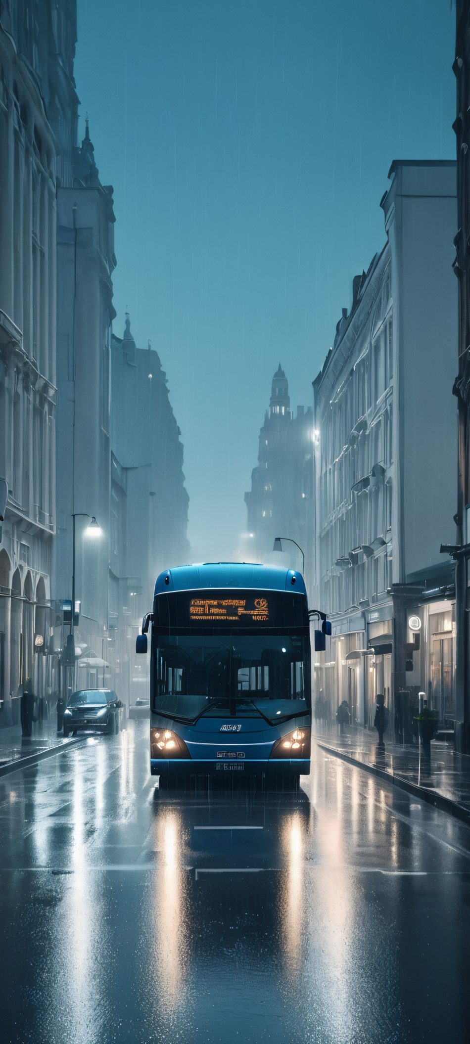 A moody rainy day scene of a bus on a city street, perfect for iPhone and Android home screens.