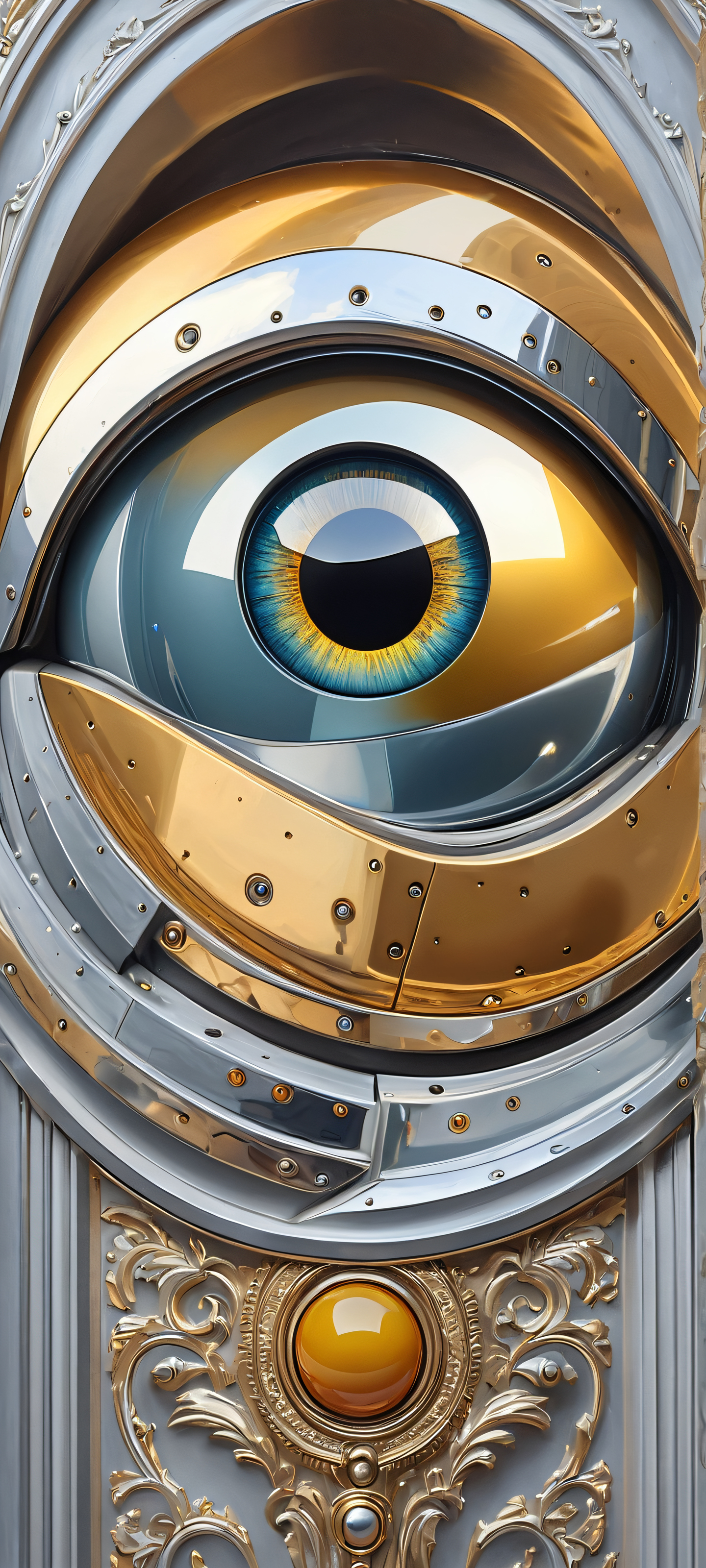 A stunning vertical mobile wallpaper featuring a retro chrome robot eye gazing out from behind an ancient museum archway, with oil painting impasto textures and subtle overcast lighting. Perfectly optimized for iPhone, Samsung Galaxy, and Android home screens.
