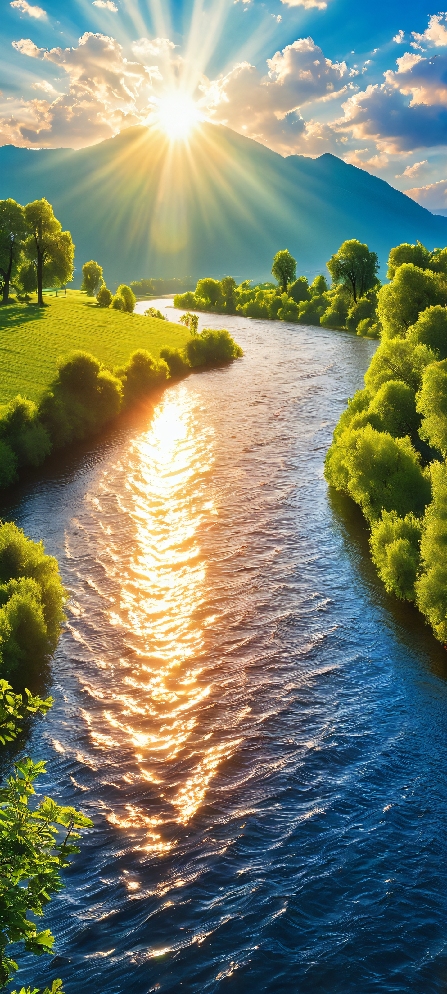 Indulge in the breathtaking serenity of this stunning vertical mobile phone wallpaper. Perfectly optimized for iPhone, Samsung Galaxy, and Android home screens, this 2K QHD masterpiece showcases the beauty of nature’s tranquility. Let the soothing sunlight dance across the water’s surface as you gaze out at this idyllic river landscape.
