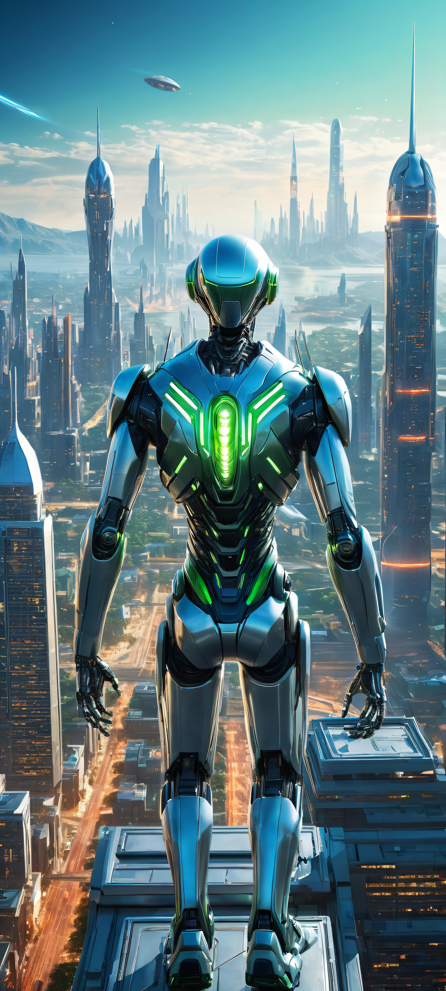 A breathtaking vertical portrait artwork of Robots and aliens placed in the lower-middle with insane micro-details, Perfectly clean and empty top half with vast pure void, contrasted with an epic cityscape in the bottom half, Award-winning digital art, pristine clarity, motion blur effects, and a hint of futuristic vibe, Ethereal lighting with radiant, brilliant colors, ray-traced reflections, and pristine clarity, emphasizing the futuristic atmosphere, [‘Metallic silver’, ‘Electric blue’, ‘Neon green’], ethereal lighting, radiant, brilliant colors, ray traced reflections, pristine clarity, portrait composition, centered subject in the lower middle, perfectly clean and smooth top half for UI, extreme depth of field blurred background, highly textured surfaces, intricate micro-details, physically based rendering, award-winning digital art, epic breathtaking scale, stunning visual impact, perfect composition, macOS wallpaper aesthetic, masterpiece, 2K QHD resolution, 9:20 aspect ratio.