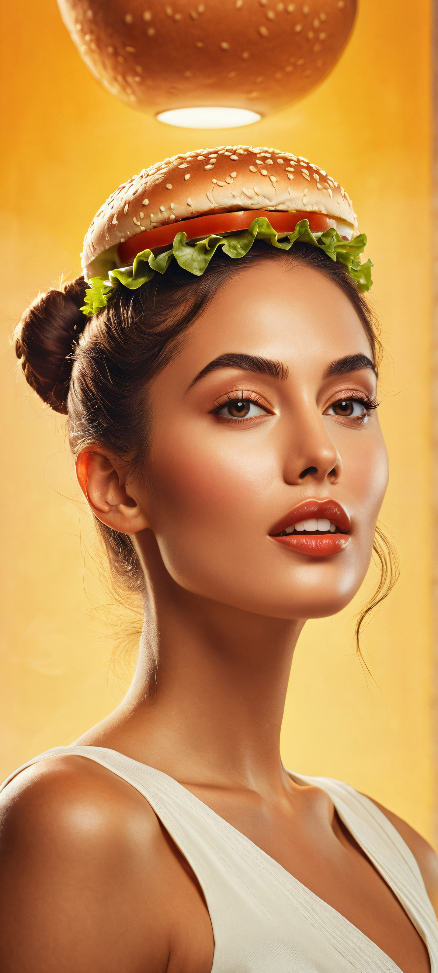 Elevate your mobile experience with this breathtaking digital artwork. A tantalizing hamburger woman takes center stage on a pristine white canvas, with insane micro-details on her bun and patty. Perfectly clean and empty top half allows UI widgets to breathe comfortably below, creating an airy and inviting ambiance that’s sure to impress. Optimized for iPhone, Samsung Galaxy, and Android home screens.