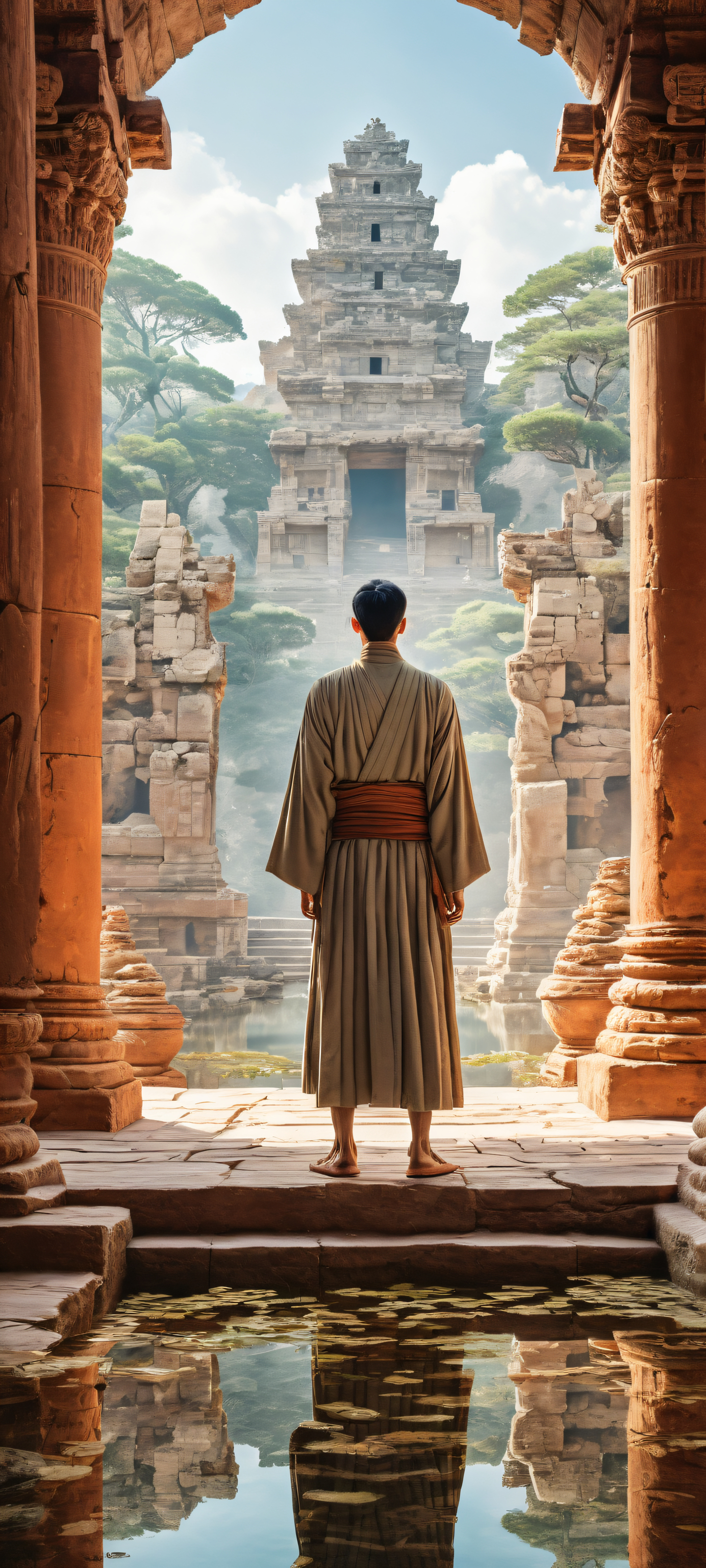 A breathtaking vertical portrait artwork of Senkuu Ishigami placed in the lower-middle with intricate micro-details of ancient artifacts and symbols radiating from his hands, A perfectly clean and empty top half with vast pure void, allowing for seamless integration with UI widgets, surrounded by the ruins of an ancient civilization, Award-winning digital art, stunning visual impact with a focus on precision and attention to detail, pristine clarity, Ethereal lighting with soft, radiant colors, ray-traced reflections, and impeccable clarity, evoking a sense of wonder and discovery, A palette dominated by warm, earthy tones such as terracotta, sienna, and umber, with accents of golden light and subtle hints of blue, ethereal lighting, radiant, brilliant colors, ray traced reflections, pristine clarity, portrait composition, centered subject in the lower middle, perfectly clean and smooth top half for UI, extreme depth of field blurred background, highly textured surfaces, intricate micro-details, physically based rendering, award-winning digital art, epic breathtaking scale, stunning visual impact, perfect composition, macOS wallpaper aesthetic, masterpiece, 2K QHD resolution, 9:20 aspect ratio.